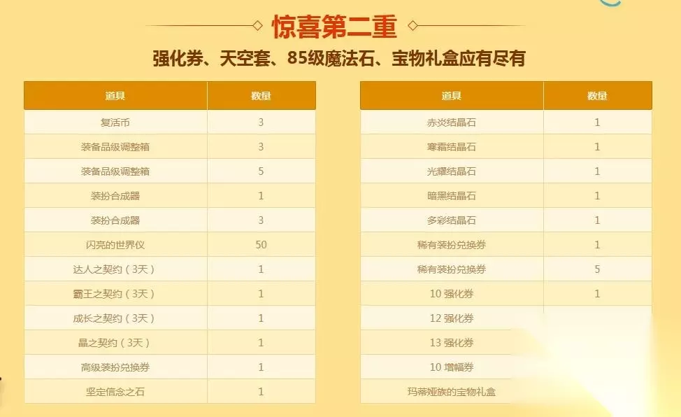 惊喜第二重 强化券、天空套、85级魔法石、宝物礼盒应有尽有