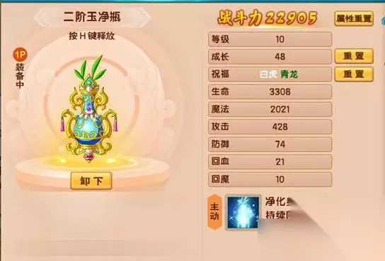 3、虽然战力不错,但是还是推荐大家使用白虎、青龙祝福,或单属性青龙祝福的二阶玉净瓶,因为玉净瓶最大的作用还是回复蓝量,拥有更短的CD可以释放技能的次数也是更多的,所以可以将收益最大化。