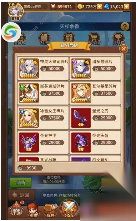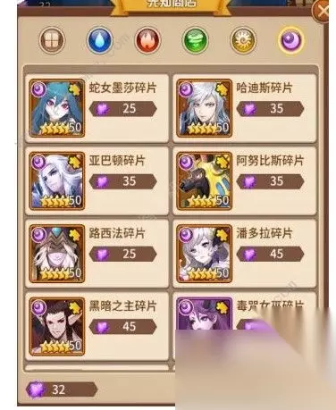 积分商店(跨服天梯):每周六、日开启,每人每天拥有10次挑战机会,挑战机会耗尽可以通过钻石购买额外的挑战次数,每次挑战获胜可以获得50积分,每周一到每周日七天,每天可以膜拜三次,每次获得50积分。星期日晚上11点结算,按排名获取积分。(这里的跨服是小范围跨服,基本都是同一天开启的服务器在一个赛区,大家不用担心遇见老区的大佬) 商店中的各种英雄获取方式胖胖已经给大家介绍完毕,下面就让胖胖给大家说说游戏主页里还没给大家提到过的功能吧。精灵商店:精灵商店每两小时获得一次刷新次数,储存上限为五次,大家可以通过精灵商店快速的获得进阶石(前期缺进阶石的时候可以少量购买10W金币100个进阶石的商品),3、4星英雄(金币购买不算太亏,3、4星的金币光暗英雄必买)。锻造屋:通过锻造屋大家可以消耗原材料与金币合成装备与符文,符文对于这个游戏来说尤其重要,也是消耗金币的最大地点。不同等阶的符文属性不同,携带技能的品质也不同,品质从低到高分别为星辰、月亮、太阳、彩虹、闪烁五个等阶,除了闪烁符文携带两个基础属性外,其余等阶符文均只能携带一个基础属性,星辰符文无法携带技能,月亮符文可携带一个低级技能,太阳符文可携带两个中级及中级以下的技能,彩虹和闪烁符文可携带两个高级及高级以下技能。技能的种类繁多,不同的英雄需要搭载不同的符文才能更好的发挥英雄的作用。 同一技能不同等级在同一英雄身上无法叠加生效,以最高等级为准。符文的合成是有几率失败的材料符文使用的越多,合成几率越高,最低使用两个合成,五个必定成功。技能种类繁多,胖胖在这也就不给大家一一列举了,具体的使用方式也只有仁者见仁智者见智啦!冒险:玩家可以使用五个英雄组成一个队伍进行冒险,每一次冒险均为1V1战斗,每击败一个boss可拾取相应地图区域的资源(包含英雄碎片、符文精华、划拳获取金币和钻石、答题获取低级探宝券和金币),己方英雄将继承此次战斗结束后的生命值继续下一次战斗,回合耗尽或己方英雄死亡则视为战斗失败,己方英雄全部死亡,则冒险结束。期间在冒险区域地图内可拾取生命回复药剂,为己方英雄补充生命值。冒险商店是土豪的天堂,土豪玩家可以通过冒险商店使用钻石快速获取英雄碎片及先知水晶,平民玩家可以无视。 历练(日常副本):获取大量的金币、经验、英雄碎片、炼神石。(胖胖每天把英雄碎片副本买满了,个人觉得性价比很高,可酌情购买)历练(无尽试炼):可雇佣一个好友的英雄帮助战斗,阵容配置很重要,有奶有坦有输出才能走得更远,奖励大量英雄经验和金币,首次通关还可获得高级召唤券。历练(英雄远征):目前胖胖觉得是该游戏最难的部分,我和远征已经渐行渐远。历练(星河神殿):拥有六个神位,每个神位只有一人,是实力的象征,占据神位还可获得称谓,称谓有少量属性加成。