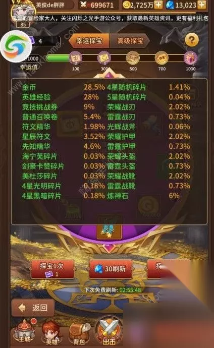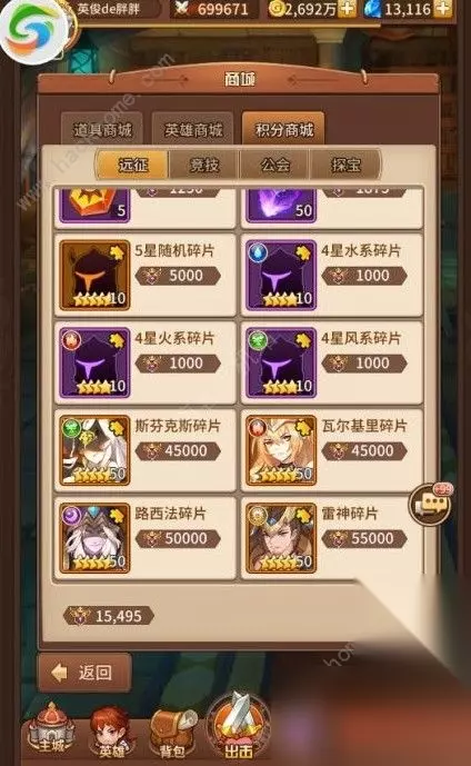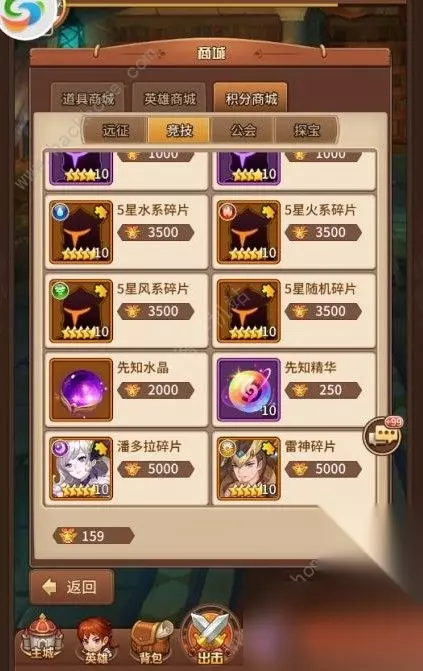 积分商城(探宝):探宝功能非常考验大家的欧洲血统,曾经有一次,胖胖一次高探单抽就抽中了神灵大祭祀,这甚至让胖胖以为自己已经成功偷渡到了欧洲大陆,拥有了高贵的小白脸血统,奈何这只是昙花一现。每次探宝都可以获得十个探宝积分,普通探宝12券可以进行15连抽,所以建议大家普通探宝尽量15连而不要进行单抽,这样才能尽可能多的获得探宝积分,并且普通探宝奖池是可能刷新出五星英雄的,所以小伙伴们可以把手头的低级探宝券攒一攒,等奖池刷出五星英雄的时候再疯狂十连,五星狗粮不是梦。并且探宝积分商城每天都会刷新一次,大家可以用手头的探宝积分换取五星英雄哟。