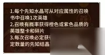 土豪和欧皇玩家可以通过高级抽奖券在召唤中获得大量的五星英雄,当抽奖到一定次数时,积分达到1000时,V3玩家还可以通过积分召唤获得一个随机5星英雄。(V2玩家可以在商场中花费25钻石购买一个高级抽奖券,每日限购一次),友情召唤也能获得高品质英雄,所以记得多加一些好友互相送小心心哟。 闯关奖励每25关赠送一只随机五星英雄,爬塔奖励每30层赠送一只随机5星英雄。 英雄的获取着实不易,特别是那些自己想要的胎五英雄,每次用高抽和先知抽奖我都会焚香沐浴,为的就是一手好运气,奈何胖胖非洲土著,运气一向不好,只能够靠着先知低保,还有各种积分来换取一些指定的胎五英雄。下面就有胖胖带领大家来了解一下各种积分的获取吧。 先知圣殿:通过先知圣殿,大家可以使用先知水晶在指定系别的英雄内进行抽奖,是获取指定系别英雄的有效手段。