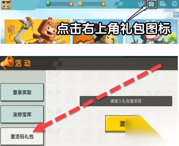 打开迷你世界,点击右上角的礼物盒,点击活动选项,点击激活码礼包按钮即可兑换。