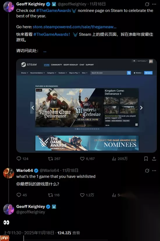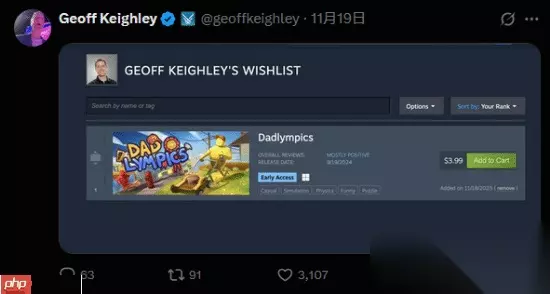 另有一段趣闻:11月18日,TGA主持人Geoff Keighley晒出一张Steam愿望单截图,显示其中仅有一款游戏。当被问及是哪款时,他仅回复了一个“?”表情(通常意味深长)。不久后,他更新截图,愿望单中只剩下一个名为《Dadlympics》的小游戏——而这恰恰是他当天才添加的!因此,许多人确信他在刻意隐藏真正的心愿。