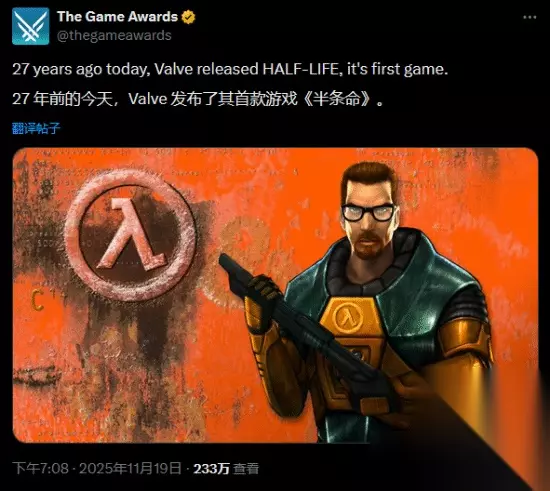 TGA官方账号今日发布了纪念《半条命》27周年的推文。尽管每年都会例行发布,但今年的氛围似乎格外不同寻常。