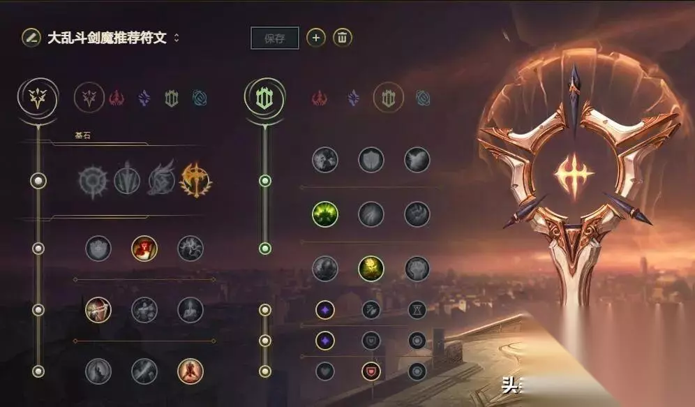主系符文:征服者+胜利+喜悦+毅力 副系符文:调理+复苏 符文解析:辅助剑魔必须带征服者。不用说,可以增强持续作战能力。 凯旋还可以提高剑魔在团战中的生存率。 第三行之所以欢乐,是因为韧性降低了。剑魔害怕被控制,使用水银鞋。再加上乱斗buff给予的20韧性就足够了。点击Joy 会让你的基本攻击感觉更好,QA 更舒服。 坚持不懈会增加在保持健康状态时造成的伤害。 选择坚决作为辅助系统的目的是为了提高团战中的生存率。 调整增加双重阻力,复苏增加血液恢复效率。 【出装和加点】