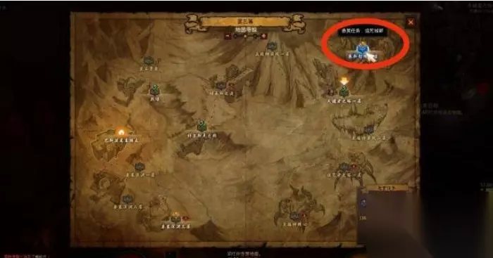 传送到指定的地图:和库勒对话完了之后,直接就去营地当中的传送点。然后选择到第三幕,右上角出现悬赏任务,点击它。