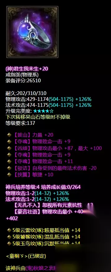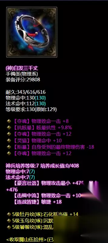 物理致命,眩晕抗性手镯。大神每类装备的打造都是恰到好处,在缺乏的地方来弥补,同时我们看到在每大类的装备上应该有的传统属性都有了或者没有的在其他的装备补。 戒指