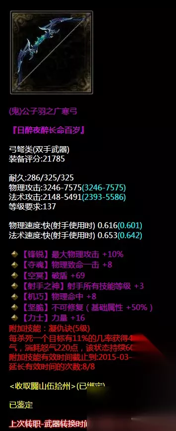 七绝双最大不可修核武器(可以说是原子弹)双破盾,电抗百分比。堪称完美的艺术品。神兵培养属性也是加破盾+152,力量+24带重置箭雨流星技能。看到这把弓小编只想说半箭都承受不了。 衣服