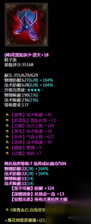 三法躲无钻腰带,神兵培养属性所有控制抗性+17。果然是和手套是一样补属性,在衣服缺少属性下,用其余装备来补。 鞋子