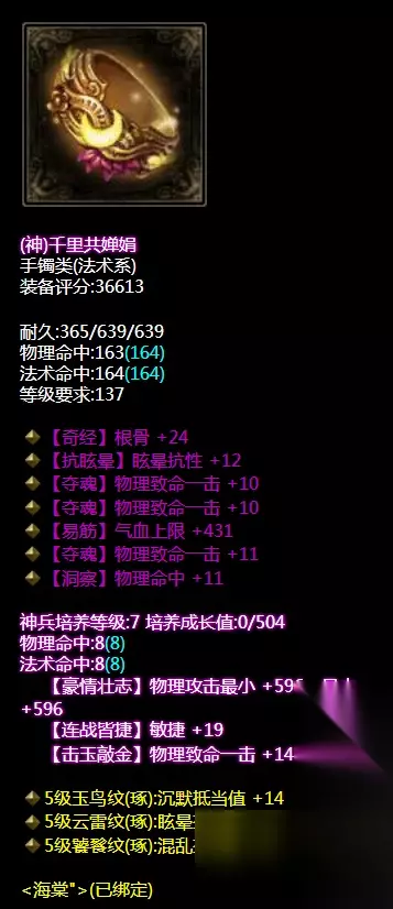 三致命。神兵培养物理致命敏捷。这装备是跟手镯戒指搭配来的,我们切往下看。 手镯