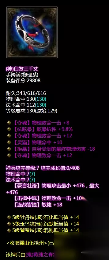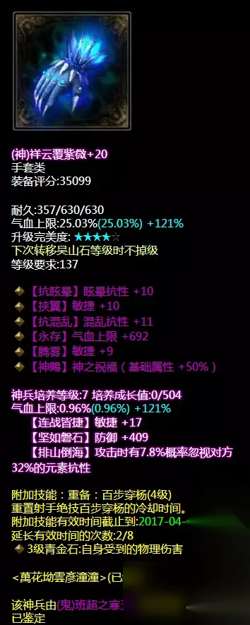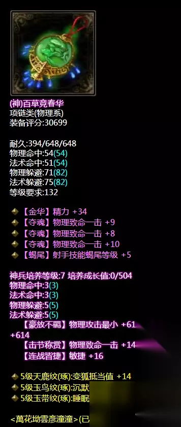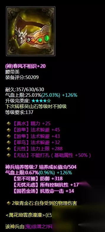 混乱抗性眩晕抗性双敏捷神赐腰带。神兵培养属性敏捷+17.带重置百步穿杨技能。气血值是有了同时也有了敏捷度,下三件应该都是以补装备属性为主。 腰带