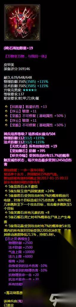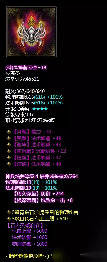 五绝双不可修双敏捷,眩晕抗性。五绝是抽冰几率比较高的选择,同事五绝的基本属性偏低往往需要的是高等的属性抽冰,大神在打造衣服上估计花了不少RMB但是双不可修双敏捷的属性也是值得的。同时神兵培养属性带所有控制抗性+19属性。 头盔