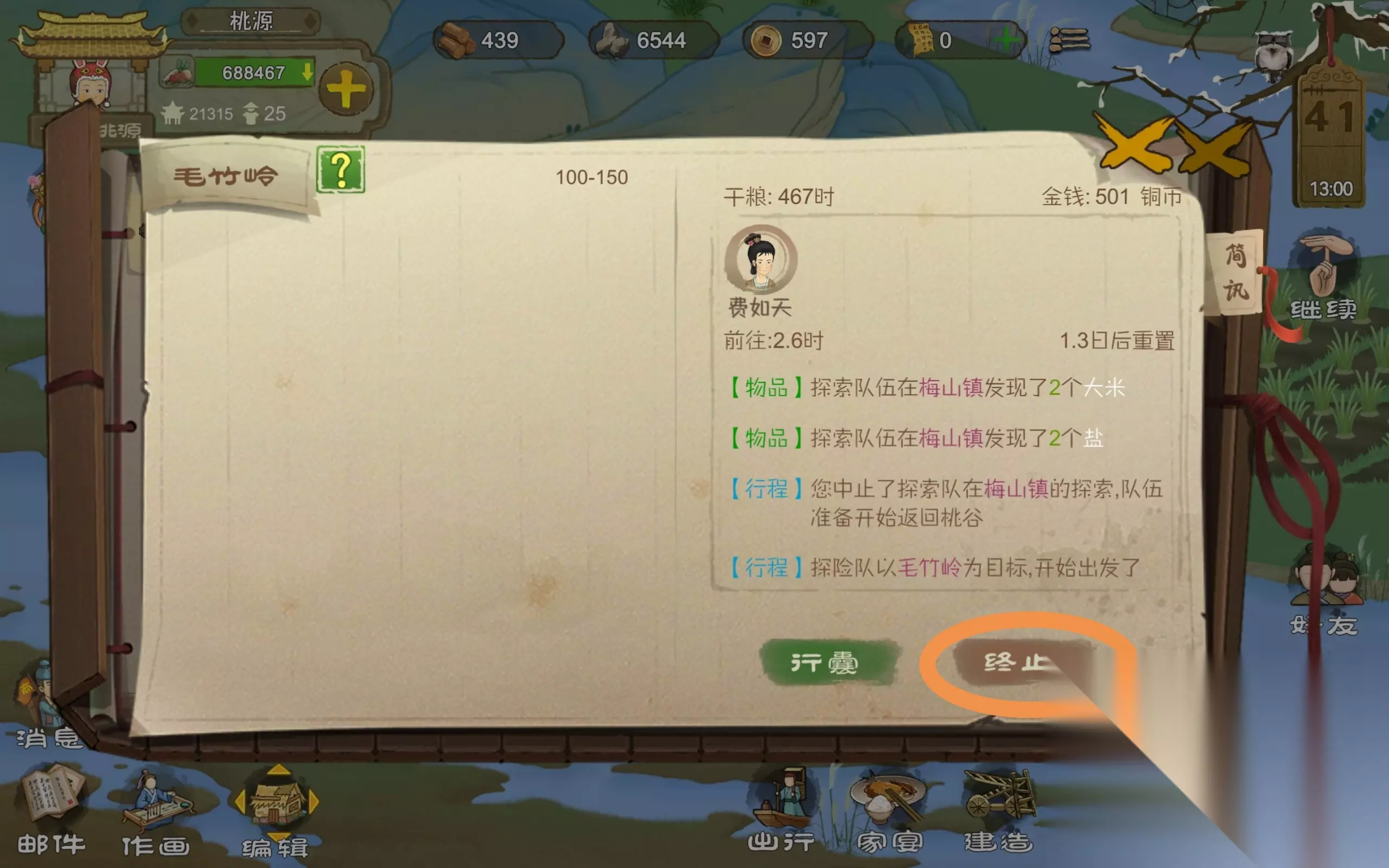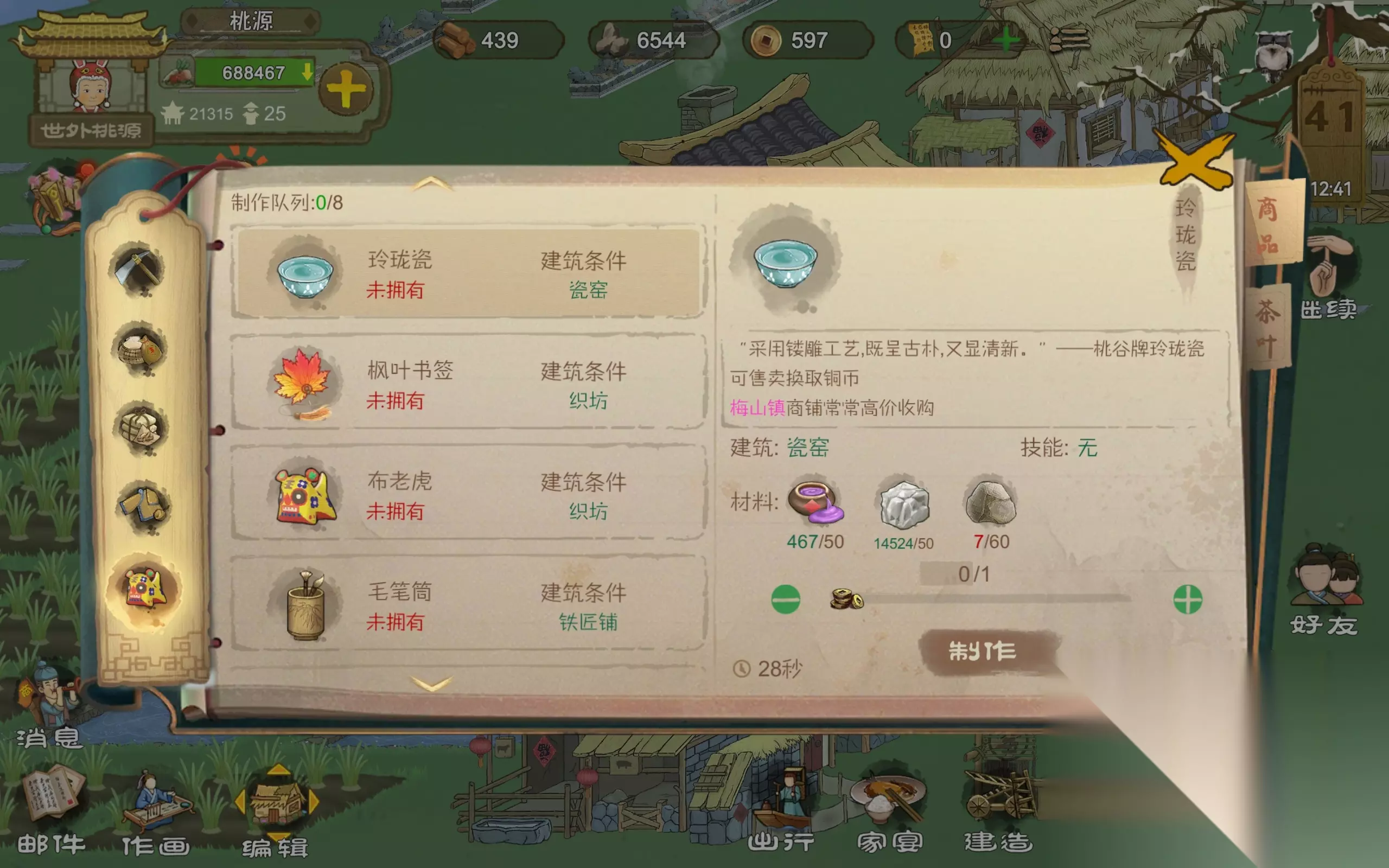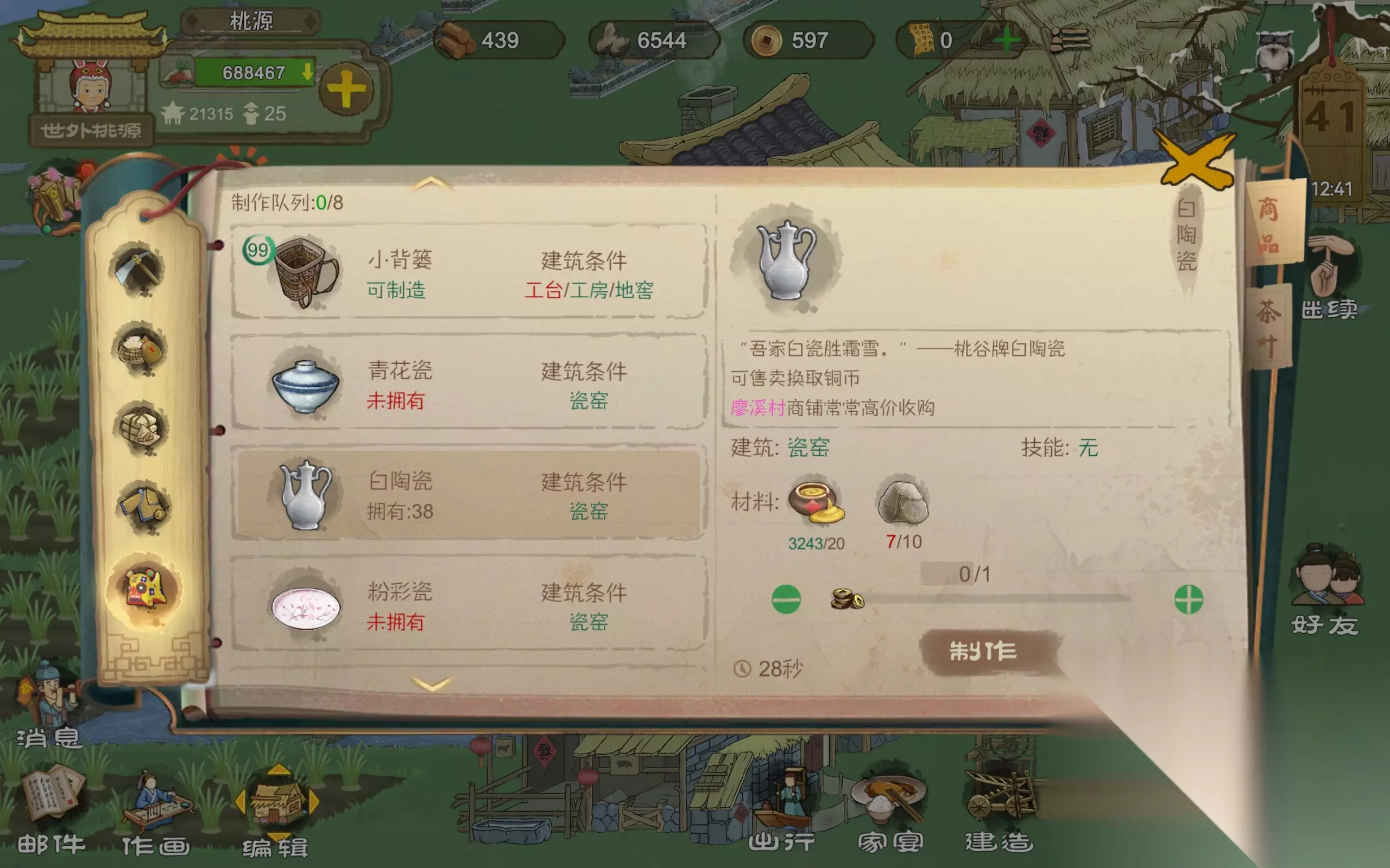 如上图,就是这个位置。(因为我没有产蛋时间为0的……) 2.如何获得充足的钱? 其实赚钱很简单,只不过你没有找到方向 ①做白陶瓷通过船坞送达到廖溪村商铺卖,廖溪村有可能1.5倍收如果他没有这个特效的话,那就等几天再看,他是每天会刷新一下的,直到他1.5倍收的时候再卖,不然会亏很多,单价270,一年大概赚五万,做白陶瓷的材料有两个,一个就是黄桃泥这个需要秋天刷新石矿洞,右边的掘泥那一栏采集才能获得,或者是采集地上裸露的桃土也可以,一个白陶瓷需要20黄泥,还有一个就是瓷石和釉药原料,这个在枫渡岭还有梅山镇的瓷窑都可以获得,当然,如果解锁了梅山镇的话,当然是梅山镇的好,因为它相必之下产量更高,而且枫渡岭,两种原料产量差距太大,而梅山镇的产量是一样。
