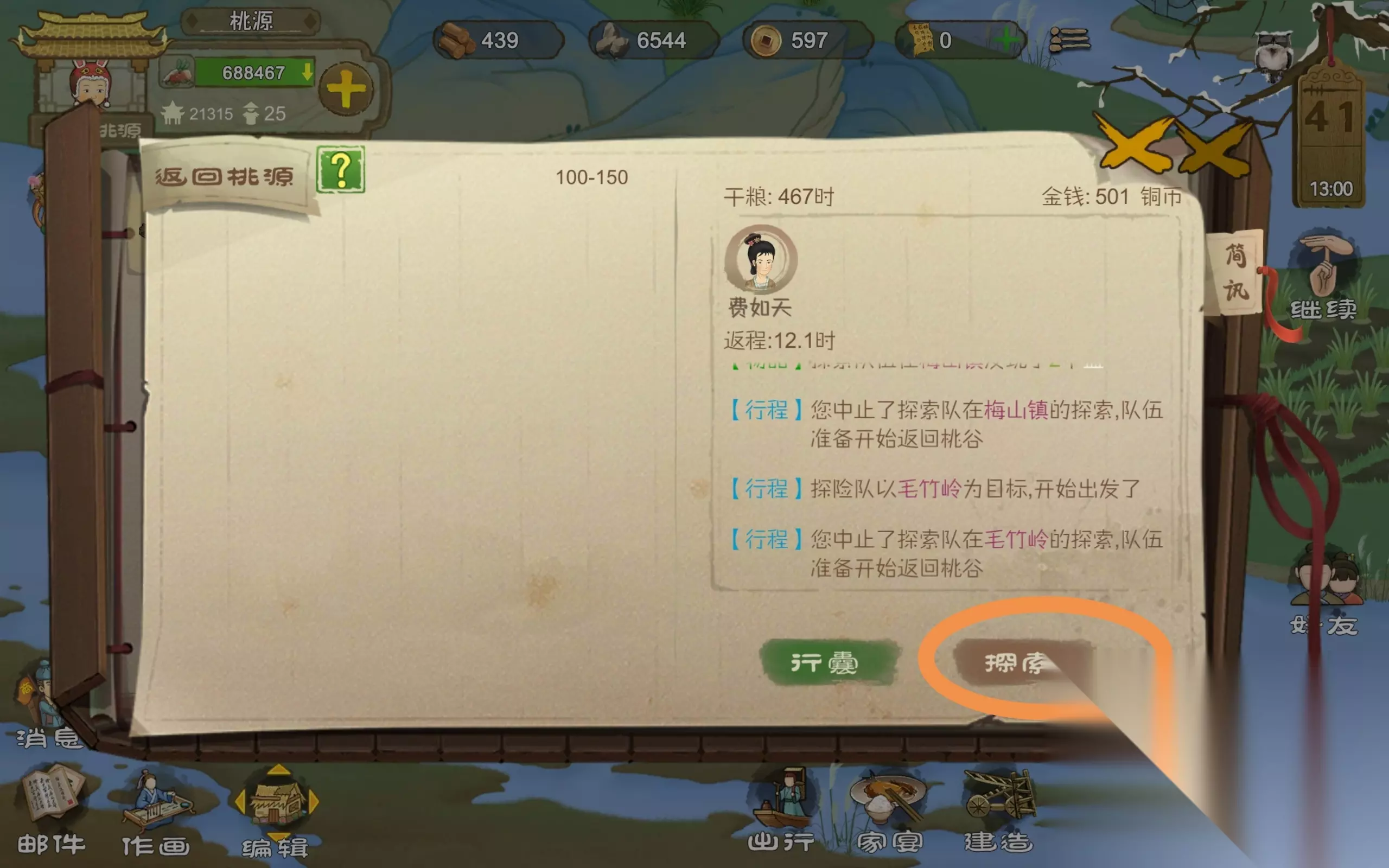 就可以选择探索的地点了,点完确定之后连续探索就完成了! 2.固若金汤,这个其实没有什么必要完成,因为不完成这个,其他的积分也够了,170的礼包也可以领了,这个就是主要要先学习工匠技能,之后建五塔,然后拆掉,然后补一个金羽弓再建,以此类推,建30个,如果只算那个黄鹦鹉毛的话,也需要128万,所以说没这么多钱不要弄。 8.铁匠铺建造前的材料怎么准备? 这个主要是要靠买,可以通过桃谷和第一个村落的商人购买那个白石块和铁块,之后就可以建成了! 9.如何获得糖葫芦? 这个主要有两种途径: ①自己制造,冰糖通过商人购买,山楂可以通过新春商船和森林探索采集之后,从金猪商人那里购买图纸,还有糖葫芦铺子的图纸,全部使用后就可以制造了。 ②通过新春商船的兑换,每天可兑换36个,上午五点刷新。
