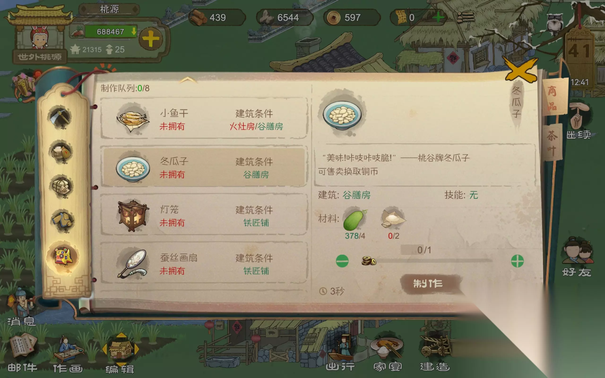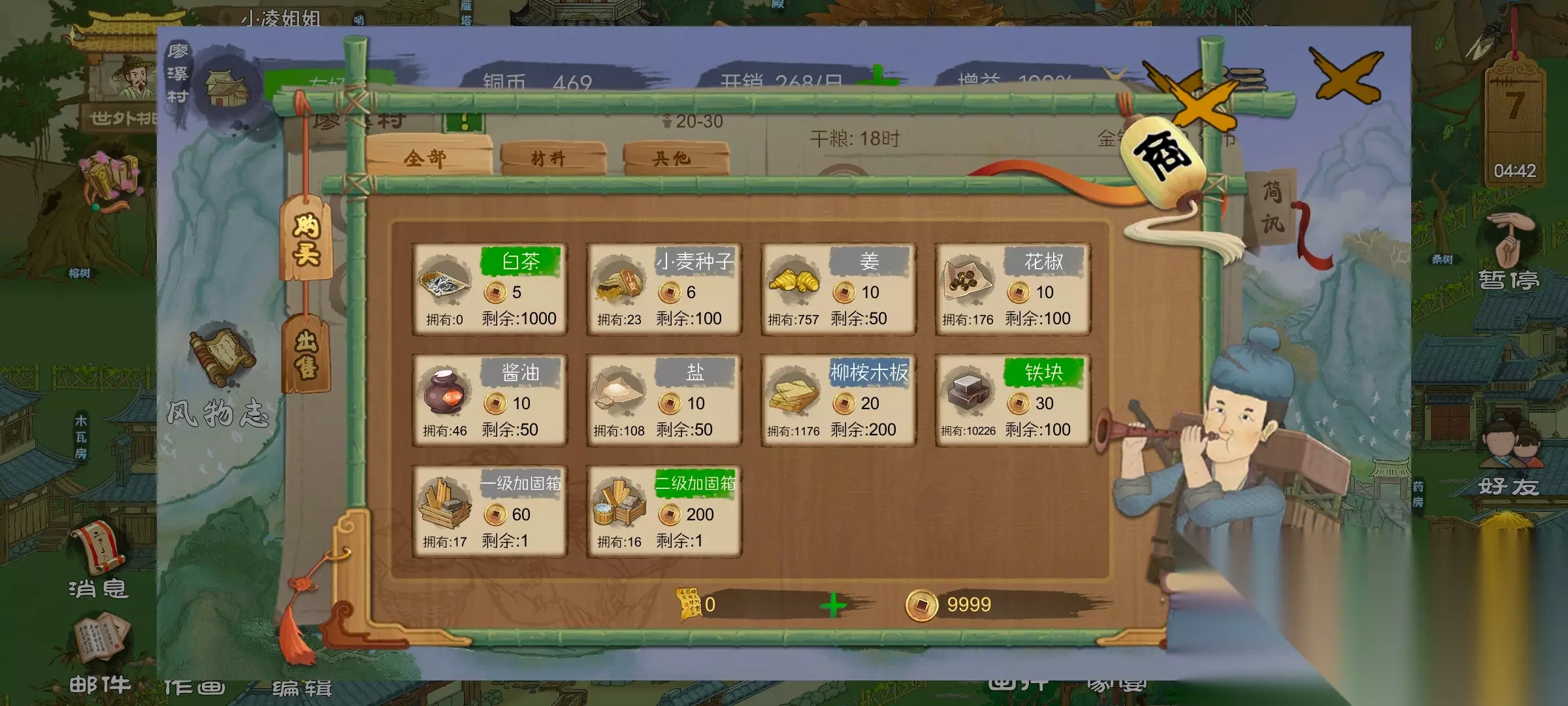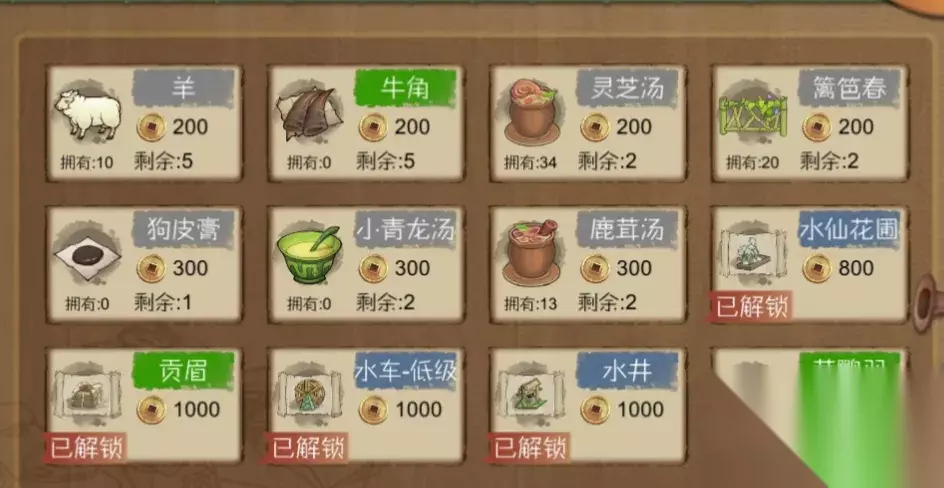 ③在新郡商人卖的西红柿种子,一次可以购买100,就是两块田,总共需要5000,一块田的利润是2000,但是西红柿他不能运到各个村子去卖,他只能等桃谷的商人过来收购或者是北山路的神秘商人那里也可以卖,同样是春秋播种,这个当然是多多益善了。 ④秋天刷新矿洞,派人去挖掘,可以挖出银矿,还有金石,金石的话,没有充钱然后用手稿解锁金锭图纸,那就用不上但是可以制作工艺品,琉璃戒刷毛竹林的好感度,或者是卖给商人,一个是300,如果充了钱解锁了的话,那就制作金锭,需要100个金石,售价是一万。银矿的话,可以合成银锭充钱了的话,可以购买那一个御龙渔竿还有那一个银鳞甲的图纸,做这两个东西,需要消耗银锭,鱼竿的话是一个,甲的话是十个,没充的话就卖给商人,一个1000。 ⑤杂七杂八的工艺品,这个建议砍柳树和成木板,然后刷拨浪鼓,拨浪鼓一个30,然后就是一些探索得到的杂七杂八的原料,有的可以制作成刷村庄好感度的工艺品,如果已经跟那个村庄建交了,那就可以卖了,一般来说的话,这类都是300,比如毛竹筒还有布老虎。有竹条的话,还可以做成小竹篓,如果有木心的话,可以考虑做一下木椅子或者是药碾,推荐做木椅子如果兽皮不够的话,再做药碾,铁块多的话,做木柜,不过一般不会有铁块多,大部分人还都买铁块呢,木柜通过船坞运到第一个村子,在商铺有几率1.2折。 3.如何获得充足的食物? 这个问题应该是大多数谷主很关心的一个问题了,新版改版之后,旧版一味的采摘野果就可以果腹的套路显然是行不通了,因为产量太少,而是进入了农耕时代,种地。应该可以说是历史的进步吧!