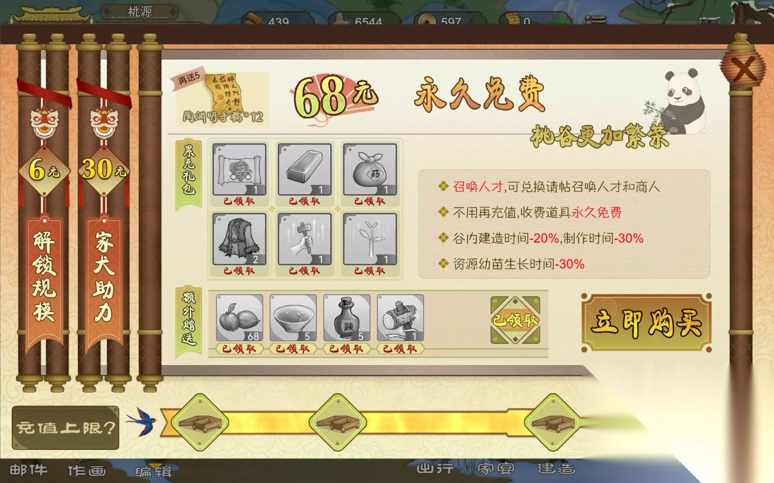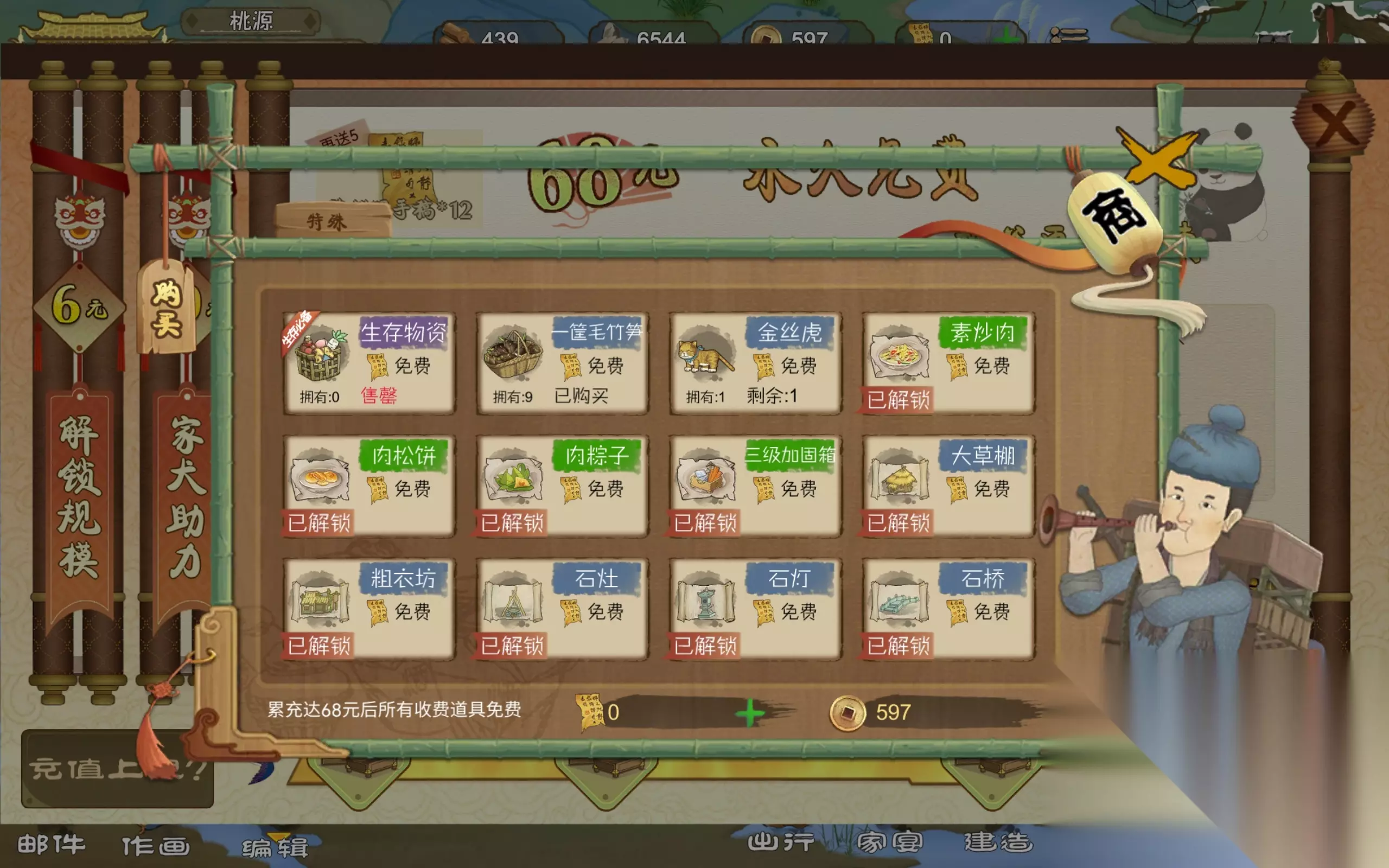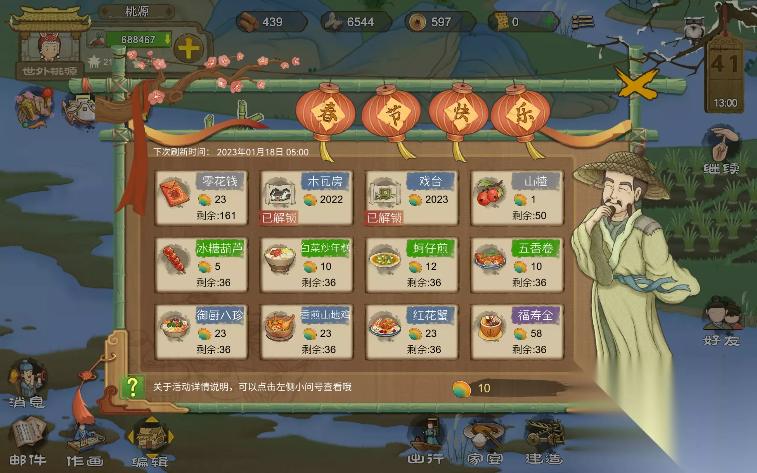 这里面还有两个图纸其中,木瓦房图纸是2022年春节的时候发放的,现在属于返场,戏台图纸是第一次发放,后续等春节活动结束后,可在桃谷商人处购买。