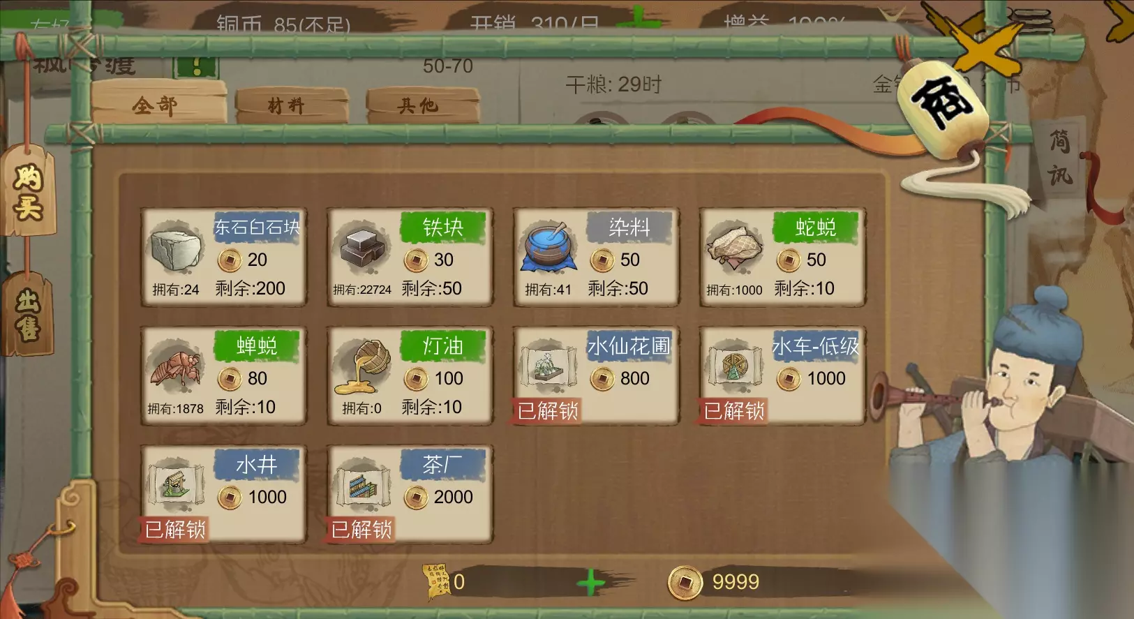 目录: 1.野鸡怎么获得? 2.如何获得充足的钱? 3.如何获得充足的食物? 4.如何使村民变得长寿? 5.如何有效的增加村民的劳力? 6.各类图纸需要在哪里购买? 7.部分成就如何完成? 8.铁匠铺制造前材料怎么准备? 9.如何获得糖葫芦? 10.如何将材料运送到友好村落,以及将友好村落产出的物品带回来? 好了,这次的汇总就这么多了,接下来我们来分条解决。 1.野鸡怎么获得? 新版更新后,这个问题可能难倒了一些玩家,其实他现在有几个条件了。 条件: ①必须建造森林小屋,新版改版后,原来探索森林是只要建造了桥梁就行,现在还有建造森林小屋才可以有效的进行探索。 ②森林探索季节必须在夏秋季,新版改版后,森林探索季节分两季,分别是春冬(可以挖一些草药以及玉露)还有夏秋(可以获得兽皮兽肉还有野鸡)两季。 ③必须全员使用兽皮弓,新版改版后,森林打猎的弓箭队伍又多了一个铁竹弓,这种弓箭只能杀死猎物,并不能有效的获得野鸡,只要全员都是用兽皮弓才可以获得。 ④需要建造禽舍,不然的话,就算打着了,野鸡也会跑掉。(记得及时投喂草料,没有草料后一两天他就会跑掉了) ⑤运气要好,其实这也算不上什么条件吧,我只是想表明他是有几率的,也就是你可能符合了以上的全部要求,但是可能还是没有抓到,不过不要紧的,多抓几次就可以抓到了。 备注:鸡也是有一定寿命的,它产蛋时间为零的时候就可以杀掉了。