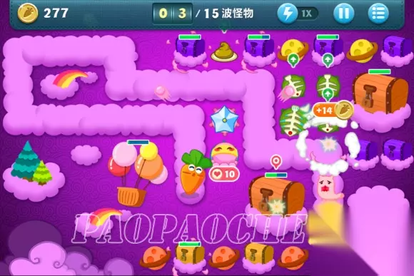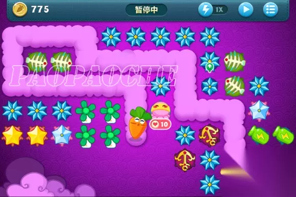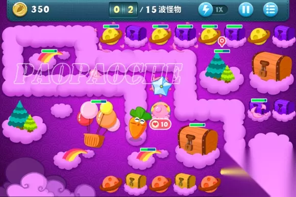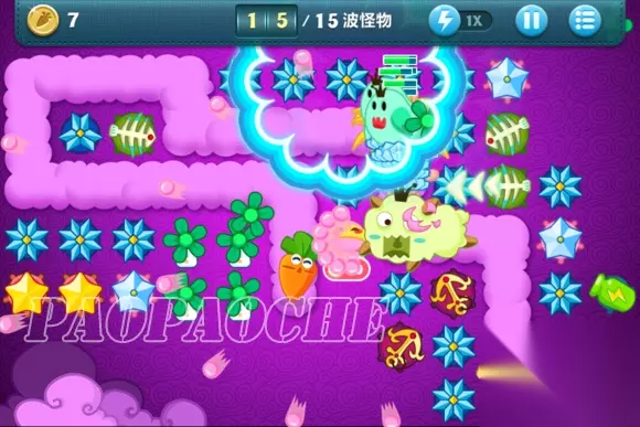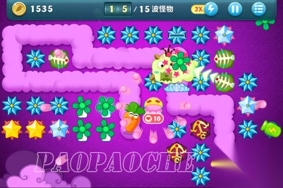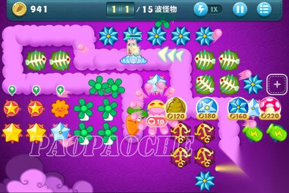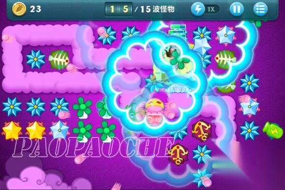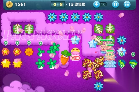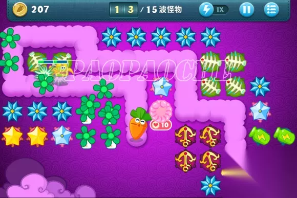 这样下去基本在15关前没什么问题了,小编用了这方法后15关前从没漏过了,个别怪跑的快的冲到前面了先点掉。在途中开始攒钱把出门瓶子升满,把图左边前面留下来的2个黄星星和太阳换成冰雪花升满。