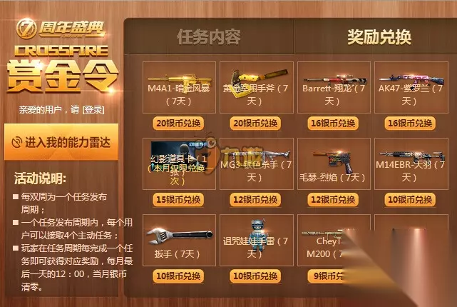 活动时间:2015年12月11日-2015年12月31日 活动网址介绍 1、任务介绍 玩家在任务周期内,每完成一个CF8月赏金令2.0活动任务,就可以获得该任务对应的银币奖励,使用银币可以兑换各类武器道具(一般都是7天使用期限)。