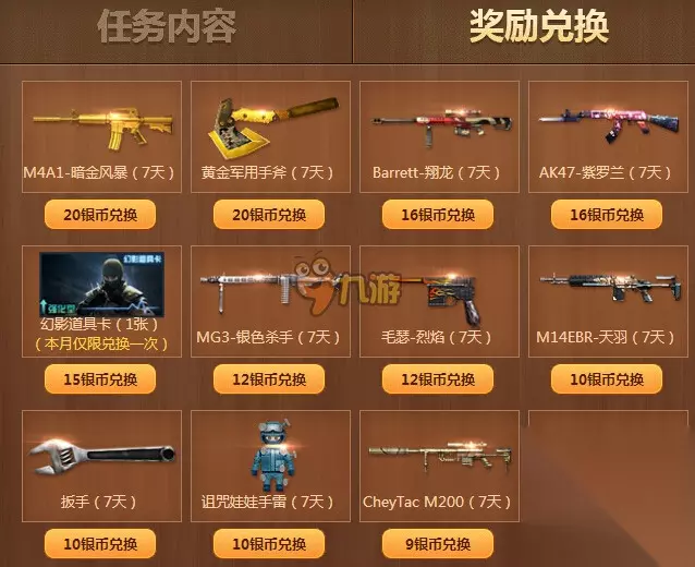 M4A1-暗金风暴(7天)20银币兑换 黄金军用手斧(7天)20银币兑换 Barrett-翔龙(7天)16银币兑换 AK47-紫罗兰(7天)16银币兑换 幻影道具卡(1张)(本月仅限兑换一次)15银币兑换 MG3-银色杀手(7天)12银币兑换 毛瑟-烈焰(7天)12银币兑换 M14EBR-天羽(7天)10银币兑换 扳手(7天)10银币兑换 诅咒娃娃手雷(7天)10银币兑换 CheyTac M200(7天)9银币兑换 沙漠之鹰-暗炎(7天)8银币兑换 活动说明 1、每双周为一个任务发布周期; 2、一个任务发布周期内,每个用户可以接取4个主动任务; 3、玩家在任务周期每完成一个任务即可获得对应奖励,每月最后一天的12:00,当月银币清零。 看了上边的CF最新活动专区大全,各位玩家是否都了解这款游戏全部2.0赏金令抽奖活动内容玩法规则介绍,知道CF2.0赏金令抽奖活动网址,以及知道怎么玩穿越火线2.0赏金令抽奖活动呢! 现在下载233乐园APP,千万破解游戏免费任你玩啦!你还在等什么,点击进行下载吧!