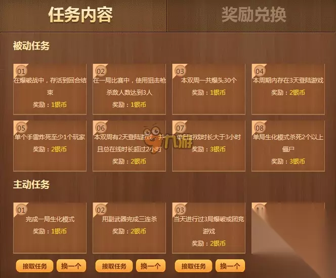 被动任务: 01在爆破战中,存活到回合结束 奖励:1银币 02在一局比赛中,使用狙击枪杀敌人数达到3人 奖励:1银币 03本双周一共爆头30个 奖励:1银币 04本周期内存在3天登陆游戏 奖励:2银币 05单个手雷炸死至少1个玩家 奖励:2银币 06本双周有2天登陆游戏,并且总在线时长超过2小时 奖励:2银币 07单日游戏时长大于3小时 奖励:3银币 08单局生化模式杀死2个以上僵尸 奖励:3银币 主动任务: 01完成一局生化模式 奖励:1银币 02用副武器完成三连杀 奖励:2银币 03当天进行过3局爆破或团竞游戏 奖励:2银币 04本周期内完成10次审判并且至少5次审判正确 奖励:3银币 小编推荐一款CF移动版手机游戏《火线精英》给各位玩家,让你随时随地进行射击! 《火线精英》是一款全3D视角FPS竞技射击手游,游戏采用便携的双摇杆操作,玩家可以自由控制移动射击。完美兼容手机与WIFI网络,实现4V4等多人对战。除爆破、生化等多种竞技模式外,游戏与众不同的机甲模式,独有的科幻风格,让玩家可以变身为战力爆表的酷炫机甲,让你的敌人闻风丧胆!另外还有千种枪械、百张地图任你挑选,尽情发挥你的战斗狂热。