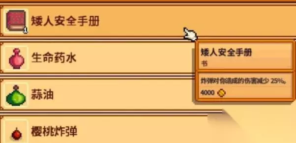 但两处矮人都在矿洞内经营着自己的商店,鹈鹕镇矮人出售的东西在流程内都是比较有用的,矮人安全手册售价为4000,作为能力之书的一种,首次阅读就能获得炸弹伤害对自身减伤的效果,属于全流程必备的一本书籍。石制大箱子图纸也推荐玩家购买,虽然在功效上和木制大箱子相同,都是有着70个储物空间,但制作原料上只需要石头,对于经常炸矿的玩家来说,也是最不缺少的资源。