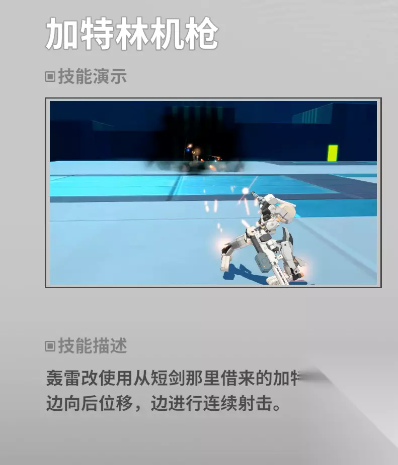 而副格派生则会让轰雷以高速后退一段距离并射出加特林子弹,一整套动作下来,即使轰雷处于空槽状态也能位移一段相当长的距离,如果再配合副射给的体操的话,轰雷这台机子的机动性和气槽战能力是非常强的。