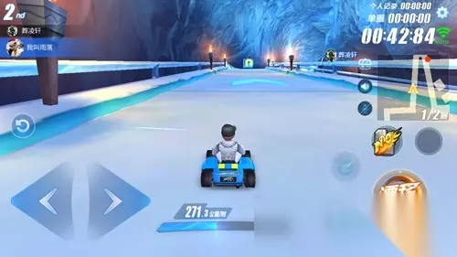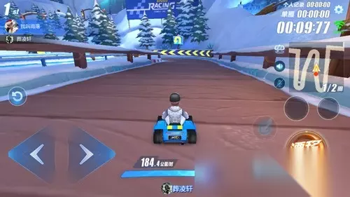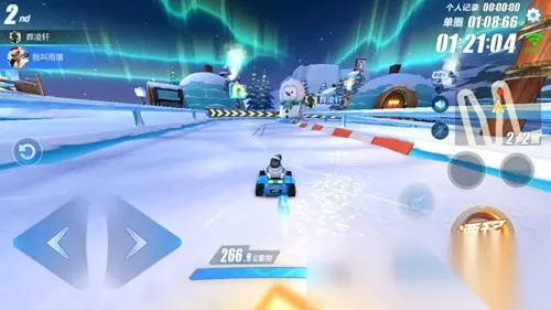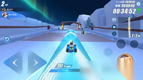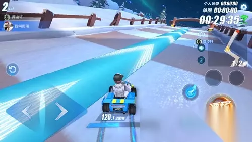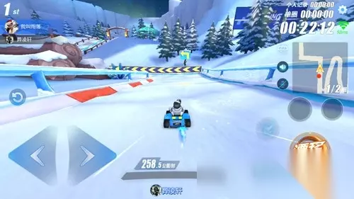 前面两个弯道是木板地面,第三个弯道地面是积雪,并且在转弯处有一个近道缺口,如果想要从缺口超车,那么要提前算好转向时机。