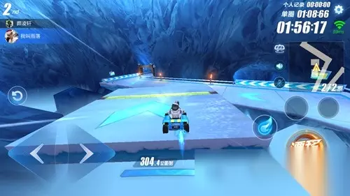 经过山顶180度转向后开始向下俯冲,这时候左侧有一些漂浮的台阶,通过使用氮气喷射加速,可以让我们利用这些台阶更快到达下方的道路。