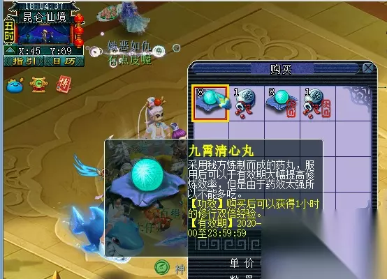 昆仑修心境(挂机玩法) 活动时间:2020年12月1日12:00-2020年12月29日12:00 任务NPC:离火兽(长安城230,120) 活动条件:等级≥10级,单人付费玩家。 活动介绍: 佳节之时,昆仑仙境再度开启。 挂机玩法,活动期间玩家(≥10级,单人)可于位于长安城(230,120)的离火兽处进入昆仑仙境。每3分钟可获得一次经验奖励。 进入昆仑仙境后,可以根据挂机时间选择购买九霄清心丸/天机培元丹。 九霄清心丸8w/颗,每日可购买8次;天机培元丹2w/颗,每日可购买一次。