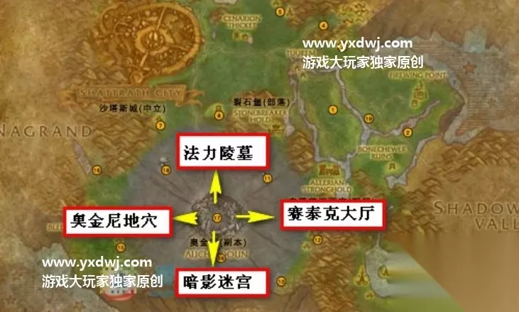 奥金顿副本群入口 我们还可以根据门口的标志,来判断哪个副本是我们应该去的。 我们可以在门口看到两个鸦爪风格的紫色火炬,这就说明里面是鸦人的副本,赛泰克大厅