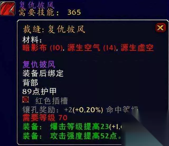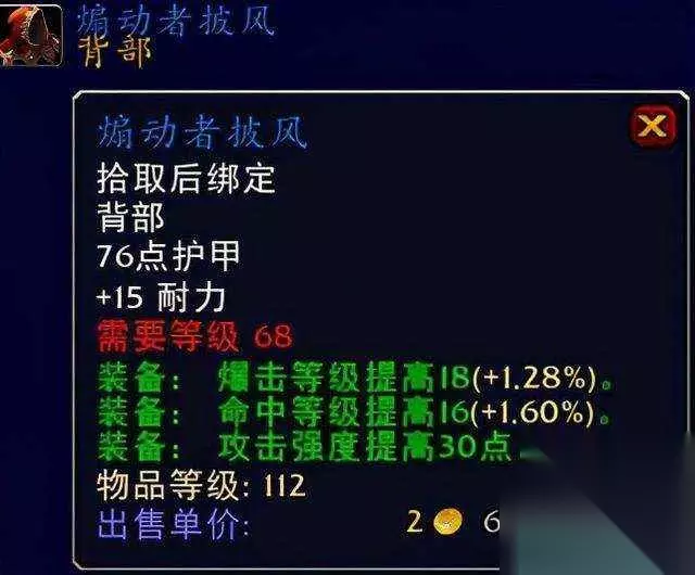 pAO 煽动者披风pAO 复仇披风系裁缝专业出品。pAO 煽动者披风系暗影迷宫BOSS煽动者布莱卡特出品。pAO 虽然喵叔真心不想推荐这个复仇披风,但是无属性加持的它就是那么的优秀,实乃前期土豪输出玩家的首选披风,当然喵叔也知道看喵叔文章的还是有很多休闲的平民玩家,那么这款煽动者披风就是作为普通玩家的你的首选好东西了,英雄模式和普通模式均可掉落的它真心不错,虽然属性只加了耐力,但是你看它的装备效果高爆击高敏捷而且还有不俗的30点攻击强度提高,着实是蓝色装备紫色品质的好东西,当然也只有像喵叔那么茁壮且可爱的专业人士才懂,所以喵叔我也要果断的分享给普通的你,推荐指数满天星辰。pAO ⑤胸部装备:原始打击外衣、恐惧编织外套pAO
