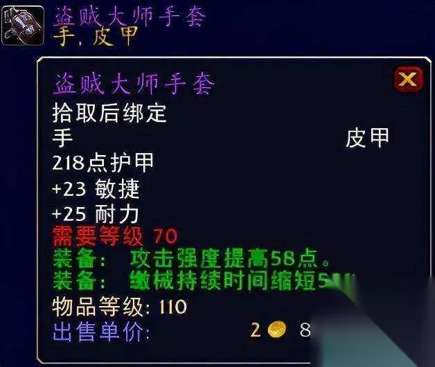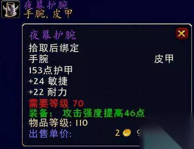 pAO 夜幕护腕pAO 夜幕护腕系旧希尔斯布莱德丘陵BOSS时空猎手出品。空旷的旧希尔斯布莱德丘陵这个副本至今让喵叔记忆深刻,开放式的副本模式也很是让人喜欢,虽然当年那个NPC走得有点慢吞吞,但是这就是我们值得念想的经典之一啊。这个夜幕护腕的话高敏捷高攻强无疑不错,身为一名专业盗贼玩家的你可千万别错过了哦,推荐指数满天星辰。pAO ⑦手部装备:魔能皮甲手套、盗贼大师手套、眼镜蛇鳞片手套pAO