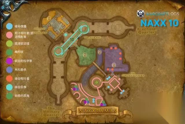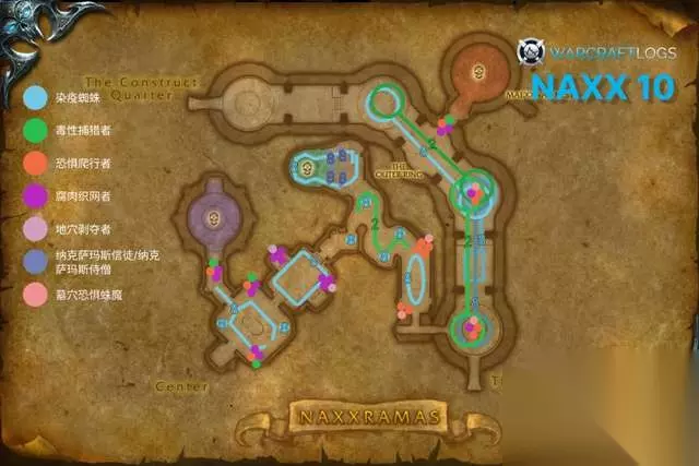 副本地图小怪分布 地图制作WCL-Pit 一、阿努布雷坎 1、穿刺 瞬发,45码。 10人:阿努布雷坎朝一个目标方向释放穿刺,这条路线上的所有玩家将受到6257到8043点物理伤害。并被击飞到空中,落地时将受到一次掉落伤害。 25人:阿努布雷坎朝一个目标方向释放穿刺,这条路线上的所有玩家将受到7394到9506点物理伤害。并被击飞到空中,落地时将受到一次掉落伤害。 建议:分散站位,被击飞的人重点治疗。 2、虫群风暴 3秒施法,25码,90秒冷却。 10人:每隔70-120秒,阿努布雷坎召唤虫群攻击30码内的所有敌人,持续16秒。身处虫群中的玩家无法攻击和施法,并每2秒受到1707到2193点自然伤害,持续6秒。可叠加。施法期间,阿努布雷坎自身的移动速度降低至60%。 25人:每隔70-120秒,阿努布雷坎召唤虫群攻击30码内的所有敌人,持续20秒。身处虫群中的玩家无法攻击和施法,并每2秒受到1138到1463点自然伤害,持续6秒。可叠加。施法期间,阿努布雷坎自身的移动速度降低至75%。 建议:施放此技能时,所有人远离BOSS,主T可绕着房间风筝BOSS。 3、召唤地穴卫士 瞬发。 10人:10人模式开战时没有地穴卫士,BOSS会在开战20秒后召唤一只地穴卫士。之后,每次释放虫群风暴时,BOSS最开始站立的位置会刷新出1只地穴卫士出来攻击团队。 25人:一开始,BOSS站立位置左右各有一只地穴卫士。之后,每次释放虫群风暴时,BOSS最开始站立的位置会刷新出1只地穴卫士出来攻击团队。 建议:副T接手,拉到起始击杀的位置再打死。 4、腐尸甲虫 瞬发。 10人/25人:阿努布雷坎可以从任何尸体中召唤出若干腐尸甲虫来攻击玩家,攻击较低,可以被定身/减速。地穴卫士被击杀后大约10秒会产生10个左右的腐尸甲虫。玩家阵亡后的尸体也会产生约5个左右的腐尸甲虫。 建议:安排控制/减速职业集中A掉 5、时间到! 战斗开始10分钟后狂暴,攻击速度提高150%,伤害提高500%。 二、黑女巫法琳娜 1、毒液箭雨 瞬发,15秒冷却。 10人:向附近的3名玩家射出毒箭,造成3413到4388点自然伤害,并每2秒造成1924到2236点自然伤害。持续8秒。可驱散。 25人:向附近的10名玩家射出毒箭,造成4388到5363点自然伤害,并每2秒造成2470到2730点自然伤害。持续8秒。可驱散。 建议:注意治疗和解毒。 2、火焰之雨 瞬发,40码。 10人:在随机区域内召唤火雨,对身处其中的玩家每2秒造成3007到3493点火焰伤害,持续6秒。 25人:在随机区域内召唤火雨,对身处其中的玩家每2秒造成3848到4472点火焰伤害,持续6秒。 建议:躲开。 3、陷入疯狂 瞬发,60秒冷却。 10人/25人:物理伤害提高150%,攻击速度提升50%,体型增大50%。持续30分钟。可被纳克萨玛斯膜拜者的自爆移除。 建议:牧师心控一名纳克萨玛斯崇拜者,去BOSS身边自爆,可解除该状态。 三、迈克斯纳 1、毒性震荡 瞬发,15码,10秒冷却。 10人:对面前的敌人造成4550到5850点自然伤害。 25人:对面前的敌人造成5915到7605点自然伤害。 建议:注意躲开BOSS头前。 2、死灵毒药 瞬发,近战范围。 10人:使目标中毒,受到的治疗效果降低75%,持续30秒。 25人:使目标中毒,受到的治疗效果降低90%,持续30秒。 建议:给MT解毒,在蛛网喷射之前,德鲁伊要给MT补上祛毒术。 3、蛛网裹体 瞬发,40秒冷却。 10人/25人:第一次释放在开战后20秒。麦克斯纳将除MT之外的随机1/2名玩家包裹在蛛网中,并将其弹射绑缚到入口侧的墙壁上。被绑缚的玩家无法进行任何操作,并每2秒受到3803到4648点自然伤害。其他玩家必须打破蛛网救人。 建议:及时攻击蛛网救人。 4、召唤小蜘蛛 瞬发,40秒冷却。 10人/25人:第一次释放在开战后30秒。迈克斯纳孵化8只小蜘蛛来攻击团队。小蜘蛛攻击力较低,但攻击速度很快。 建议:迅速A掉。 5、蛛网喷射 瞬发,40秒冷却。 10人:对所有玩家造成2275到2925点的自然伤害,并使其昏迷4秒。该效果无法被抵抗/免疫。被蛛网束缚的玩家不受影响。 25人:对所有玩家造成6793到7508点的自然伤害,并使其昏迷6秒。该效果无法被抵抗/免疫。被蛛网束缚的玩家不受影响。 建议:在蛛网喷射之前给MT补祛毒术,清理掉小蜘蛛,给被束缚的人补满血。 6、狂乱 瞬发。 10人/25人:当生命值低于30%时,迈克斯纳将进入狂乱状态,物理伤害提高50%/75%,攻击速度提高50%,体型增大15%。持续10分钟。 建议:RUSH。 瘟疫区