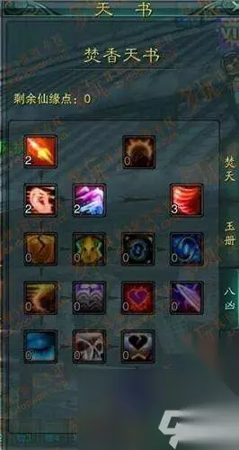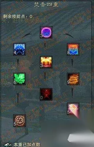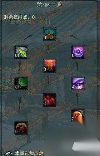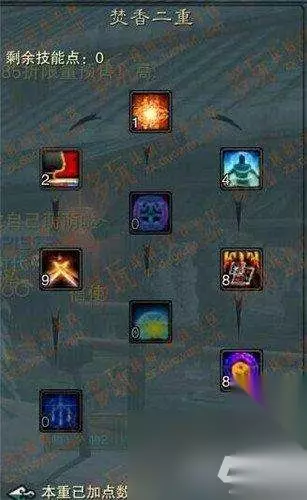 主要强化的是御魔与技能躲闪。焚香很需要这两个属性,也许其他职业会选择其一,但是个人认为焚香需要兼顾。以后阵法开6孔会加上兽神,其余两孔我偏向于鬼王与小白。 焚香绝对是一个纯土豪职业,需要堆的属性非常多,气血(不解释),真气(气血+真气总和如果大于天华的真气上限,就可以抗升皇,我们区还是有几 个NB的卡级天华的),御魔与减爆伤(不解释),技能躲闪(主要是为了抗青云的华闪跟鬼王的聚灵,偶尔也可以抗天音的无量。说到这里可能有人会说青云跟鬼王不堆技能命中么?实践证明我们区高端的卡级鬼王跟青云普遍140-150的技能命中。并且并没有强化技能命中的意向。),攻击和爆伤(非常重要,焚香其 实蛮暴力的,下面我会着重讲一下),技能命中(140就足够了,挂中州不会出现未命中)。 也许有人会问,怎么可能兼顾这么多的属性呢?这就是我要说的重点。 首先说技能加点,下面附上我的技能加点: