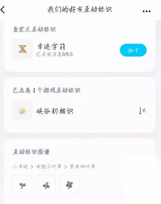 其他手Q互动标识 - 小幸运,成为新朋友并在当天成功互发消息; - 友谊三叶草,与新朋友互发消息连续超过7天; - 挚友四叶草,与新朋友互发消息连续超过30天; - 畅聊之余,与好友连续互发消息超过7天; - 聊得火热,与好友连续互发消息超过30天; - 恋爱之钥,与好友互为空间情侣且最近互发消息连续超过7天; - 深爱之钥,与好友互为空间情侣且最近互发消息连续超过30天; - 互赞之交,与好友连续在空间或资料卡互赞超过7天; - 深情互赞,与好友连续在空间或资料卡互赞超过30天; - 空间小窝,与好友在空间互访连续超过7天; - 空间别墅,与好友在空间互访连续超过30天; - 友谊的小船,与好友互为聊天最频繁的好友连续超过7天; - 友谊的巨轮,与好友互为聊天最频繁的好友连续超过30天; - 情侣,绑定情侣关系获得情侣标识,亲密值低于100分标识将熄灭; - 超甜情侣,与情侣亲密值达520分; - 神仙眷侣,与情侣亲密值达1314分; - 闺蜜,绑定闺蜜关系获得闺蜜标识,亲密值低于100分标识将熄灭; 【小编推荐】专区入口 || 视频站入口 || 体验服申请入口 || 全民竞猜赢好礼 【新英雄爆料】| 司马懿 || 瑶 || 孙策 || 新英雄:囚徒/书圣/瞬 | 【新皮肤爆料】| 李白团战皮肤:敏锐之力new || 诸葛亮团战皮肤:掌控 || 典韦穷奇皮肤 Hot!! | 王者荣耀最新攻略 赛季段位继承表 每日一题 边境突围玩法攻略 体验服爆料