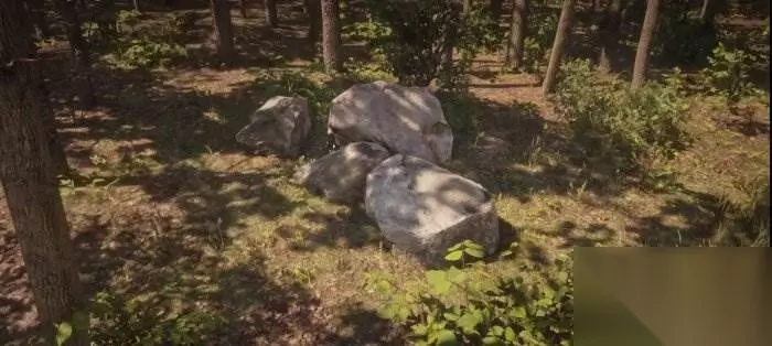 我们来到山狮刷新点的三岔路口处,找到附近的这一堆石头,把马停在靠前一点的位置(马在感受到危险时会逃跑,把它放前面起到一个警报器的作用),然后站在石头上,放置食肉动物诱饵。