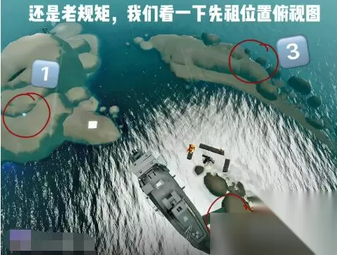 先祖具体位置: 1、第一个先祖就在船后边的那个岛屿上,玩家飞到那里就可以在缝隙中看见先祖;