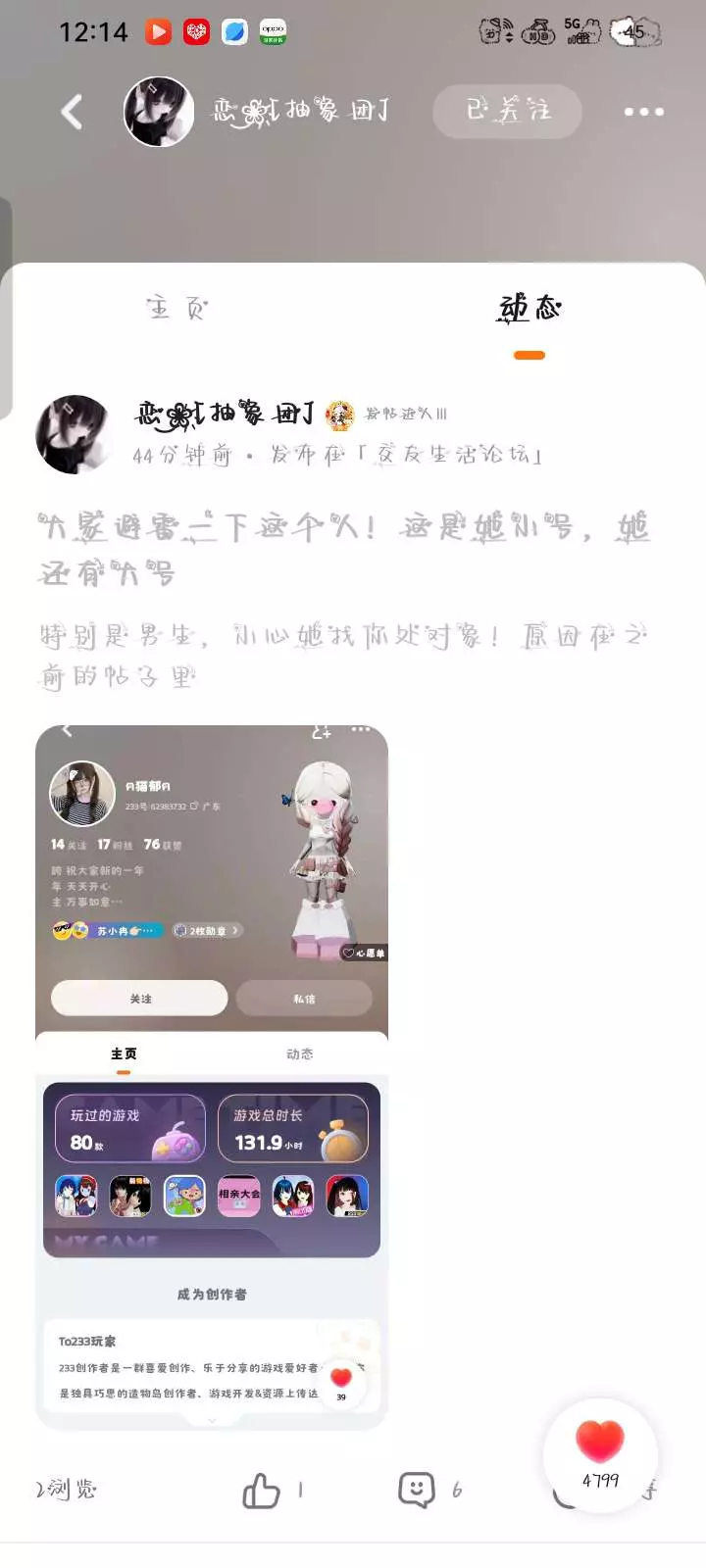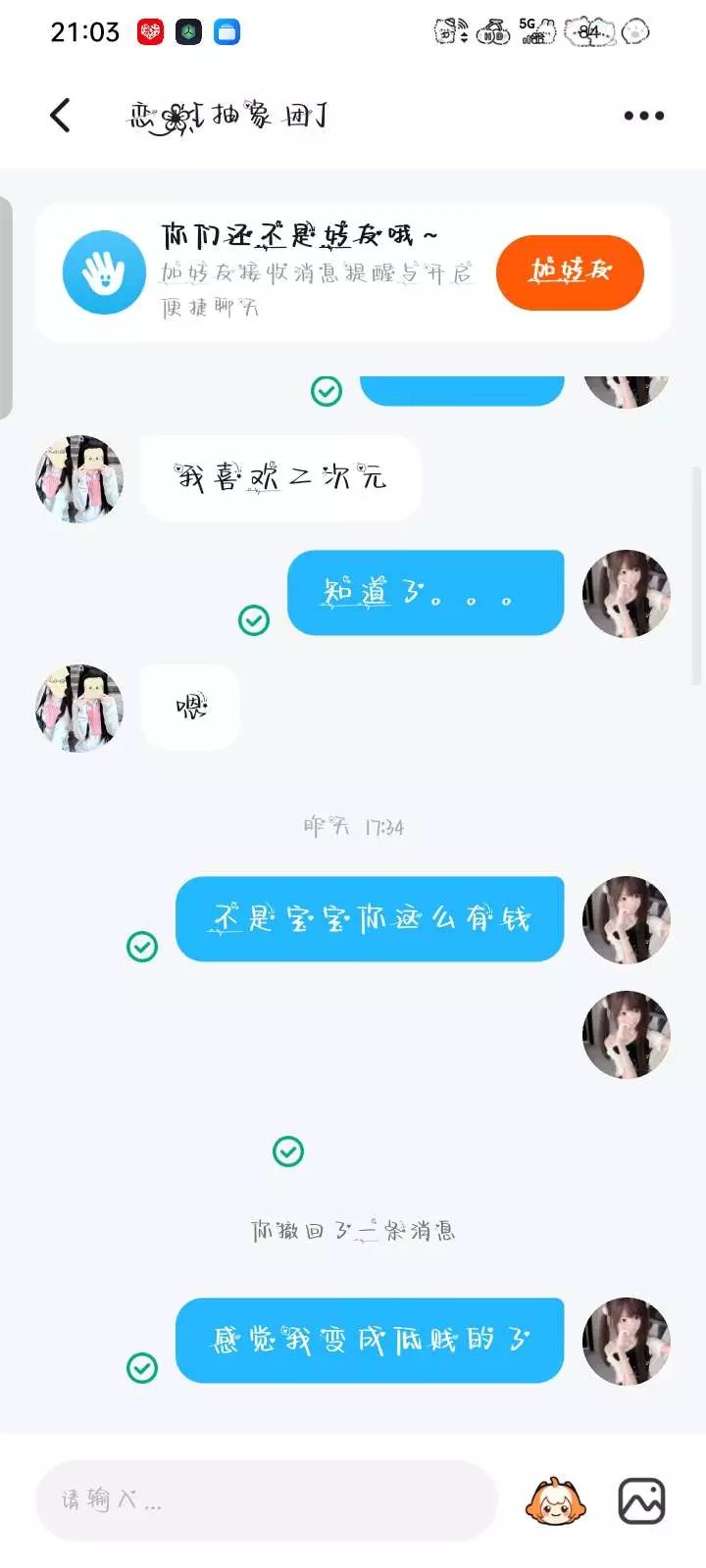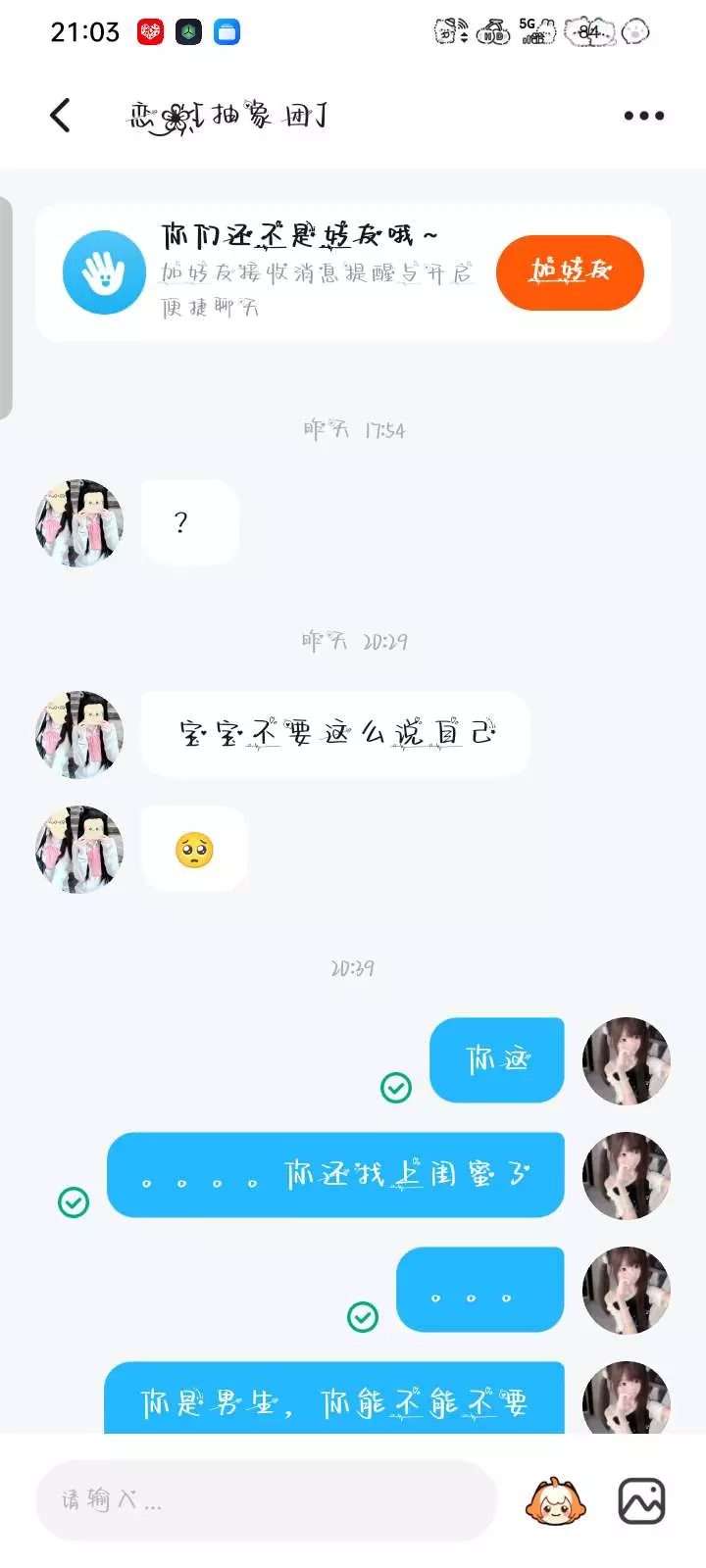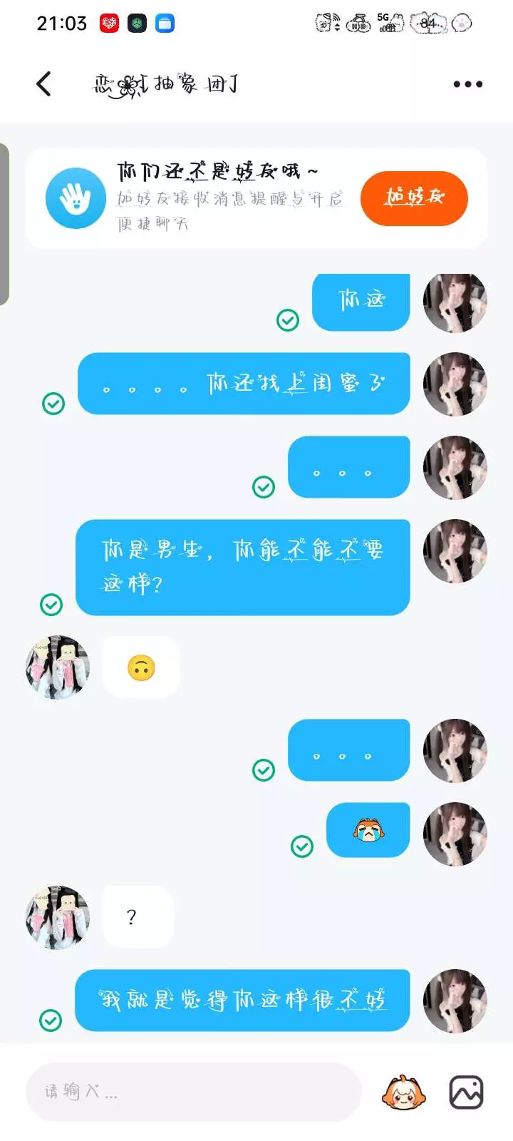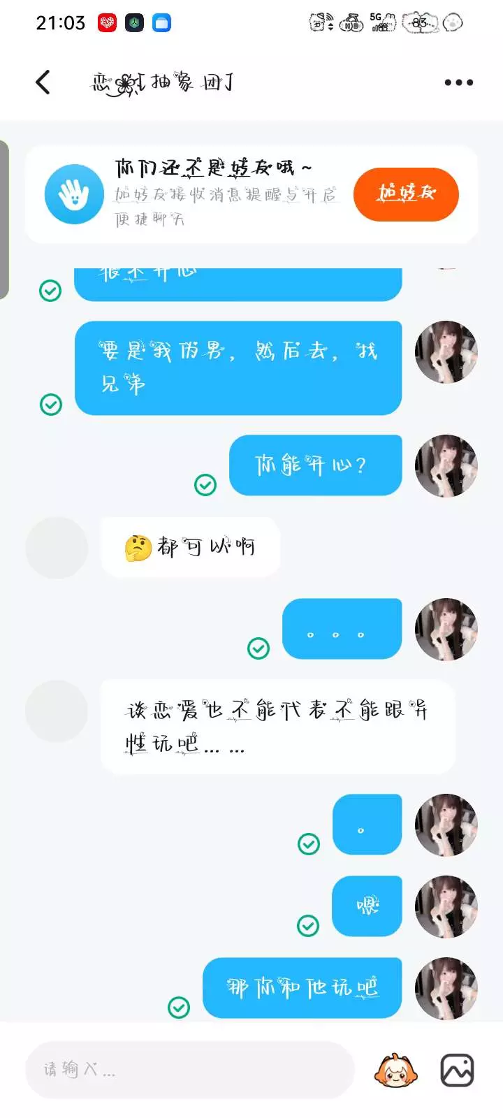网恋需谨慎,这次是我被骗了,下次说不定就是你呢?来骗我,还说什么我换单人情头你不知道?我踏马跟你换的,你当时跟我说你是男的,还说不给我看照片不好看,结果你是个女的,搞得别人欺骗你了一样,还说什么啊,当时我发了视频很火,不是我什么时候发了视频,还有我有证据是有证据,我也没有发过视频,我也没有骂你小三过哈,不行了,乐