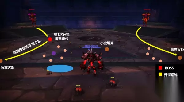 [召唤变大虫]---使一只其拉蝎虫体型变大,攻击提高1800%。(变大后打坦克大概1500左右一下, 有破甲和酸液技能,不能长时间硬坑) 战斗流程: 由于[治疗兄弟]这个技能的存在,我们需要把魔皇和剑皇分别拉在两边,法系DPS只输出魔皇,物理DPS只输出剑皇。魔皇和剑皇每隔30秒会传送互换位置,传送后会给最近的玩家释放一个强力嘲讽技能,使其或得一个较高的初始仇恨(大约5根寒冰箭的仇恨量)。 基于以上机制,对魔皇的处理可采用高暗抗SS坦或者ZS坦纯挨揍两种打法,其中SS坦可以是1名或2名,大家可根据团队自身情况自行选择。 以1名SS坦为例,站位图如下所示: