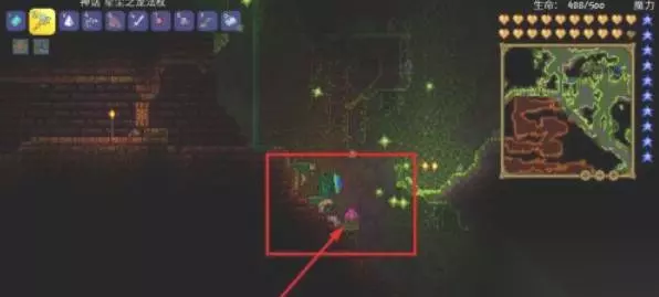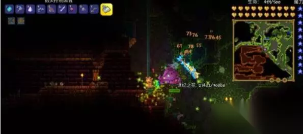 4、接着玩家需要前往丛林地下探索,可以看见粉红色的花苞,玩家需要使用镐子破坏花苞,并召唤世界之花。