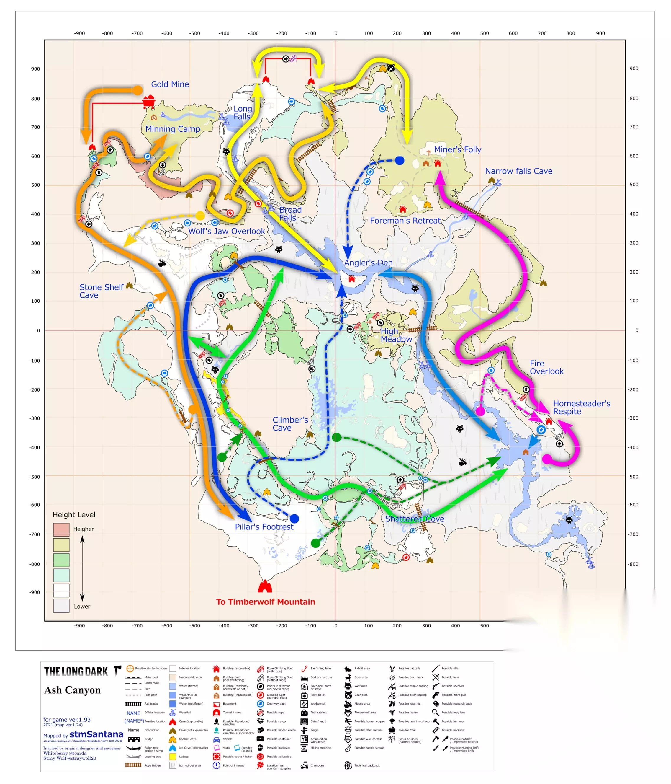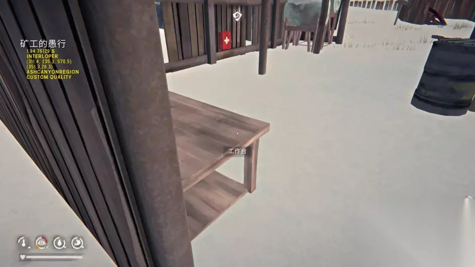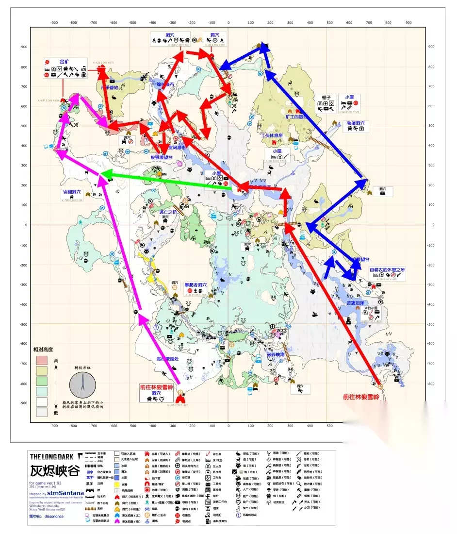 其他: 拿背包路线有很多,各有各的好。红色路线最为朴实无华,虽然路程远了点,路上狼多了点,但好在不会迷路。只有绵长瀑布洞穴内一条短登山绳,只需要消耗的少许的精力。蓝色路线需要会蹭上自耕农,注定要一堆扭伤。不过爬上火焰瞭望台之后基本是一马平川,除了路过熊洞需要注意一下之外其他时间是绝对安全的。紫色路线要从奔鹿空地的洞穴进峡谷,成本上来说天然比从回音峡谷进多耗了一条登山绳的精力,但路线上不会碰到任何狼,但是要注意三段绳下的驼鹿点。上三段绳的方法很多,如果不想花费时间中途休息的话建议携带至少两瓶能量饮料或是一根强心针以应对三段登山绳的精力消耗。绿色为红色和紫色的切换路线,这两条后半程是可以互换的,具体选那条看自身喜好。 这个图的狼分布非常集中,只存在由于苦涩沼泽,破碎峡湾,绵长瀑布、琵琶鱼巢穴周边这几个低海拔区域。只要爬过了任何一段登山绳,就再也不会再受到狼的袭扰。 峡谷底部有大片烧焦的树干,周围恒定有一层特殊滤镜,看起来灰蒙蒙的,晴天都不会消散。峡谷有很多随风晃动的木质吊桥,看起来虽然可怕,但它只晃动自身,并不会带着角色坐标移动。安全的通过吊桥方法就是沿着中轴线一直走,除非你自己从绳子的缺口走出去,否则想要掉下去是很难的。另外在吊桥上丢弃物品的选项会被禁止,但是依然可以利用诱饵快捷键把肉扔出去。 有一些不知是剧情废案还是彩蛋的物品在地图上被标成了“有趣的地点”。最有代表性的两个就是“坏掉的步枪”和入侵难度都有概率刷的熊皮大衣。坏掉的步枪只是徒有物品名,点上去是无法互动的,而熊皮大衣倒是可以真捡起来穿身上。 峡谷这个图有一些很奇怪的加温点,这些点虽然看起来虽然不可能有加温,但是确实能吃到和衰变同步的温度加成。最具代表性就是矿工愚行的棚子里层,直接导致了这里成为全图唯一一个有加温的工作台,在这里制作物品既不用担心温度还能清理幽闭风险。 毫无道理的加温点: 加温工作台:(全大熊岛仅此一家) 该图有一个明显的不恰当译名,英文原文为Angler's Den,简中译为琵琶鱼巢穴,繁中译名为垂钓者的巢穴,比简中要靠谱那么一些。 虽然灰烬峡谷和林狼雪岭相连,但如果以回音峡谷直通口做参照的话,地图怎么摆都不对劲。所以要么峡谷顺时针转90°,要么林狼逆时针转90°,总要创死一个。