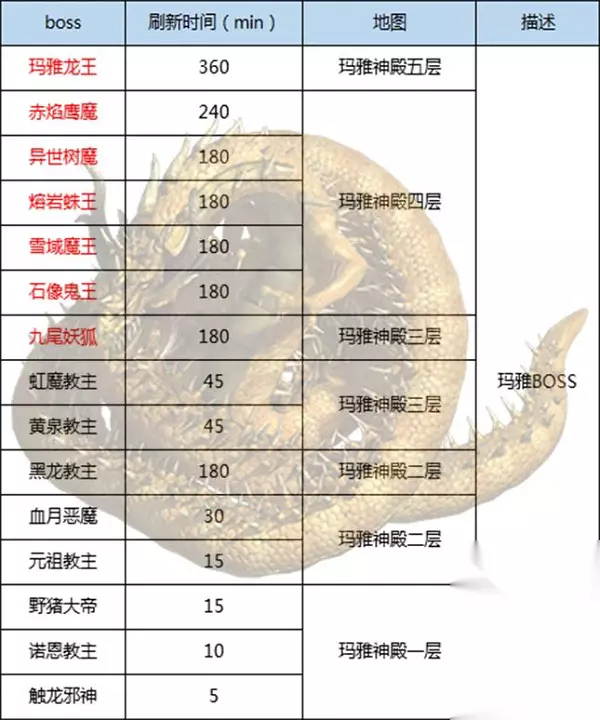 玛雅神殿大多数怪与Boss之家的类似,在这里就不做叙述了,详情参考Boss之家。唯一的区别就是进入需要消耗玛雅卷轴,而不是VIP限制。所以,只要你有足够的时间去赚绑元杀Boss你就有资格进入,来一步一步强大自己。 玛雅神殿五层的玛雅龙王才是这儿真正的主角,进入五层需要额外多付出2个玛雅卷轴。但同时需要注意的是该地图同样是无法使用随机石,Boss之家三层混战复刻有木有~ 天之Boss、魔之Boss篇
