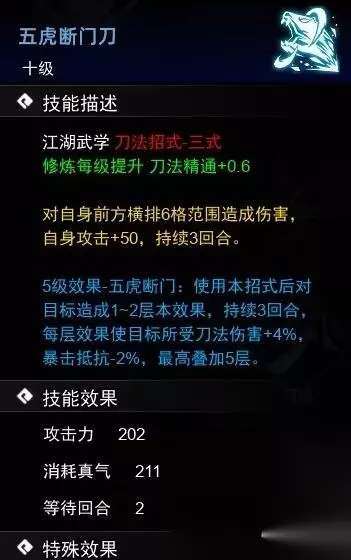 五、五虎断魂刀 1、主线在进山洞之前,前往梧桐村客栈与霸刀秦烈切磋获得。 2、前往平康城武馆购买价格为3800文。