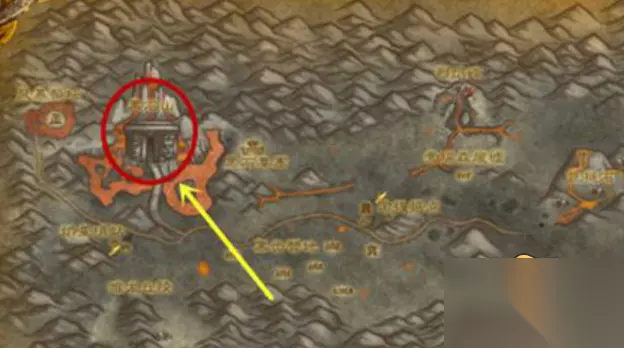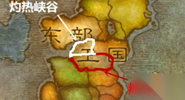 首先玩家们从主城出发燃烧平原或者灼热峡谷。地点在艾泽拉斯大陆的东部王国。部落从奥格瑞玛传送到诅咒之地或者暮光高地飞;联盟从暴风城或者铁炉堡飞。要是有小物品酒吧传送器的话可以直接使用。 图中白色位置为灼热峡谷、红色位置为燃烧平原。 燃烧平原进入黑翼之巢的入口在: