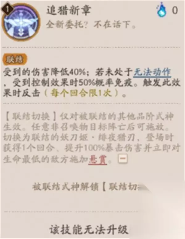 4、追猎新章(联结技) 效果类型:联结/切换机制。 当被联结式神阵亡时,妖刀姬·绯夜猎刃登场并获得以下效果: 减伤40%,50%概率免控; 登场获得1个额外回合,暴击伤害+100%; 立即对生命最低敌人施加【悬赏】。