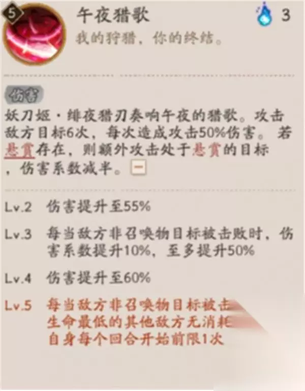 3、午夜猎歌(群攻主技) 效果:连续攻击目标6次,每次造成攻击50%伤害。若场上存在悬赏,则额外攻击该目标一次(伤害减半)。 升级效果: Lv.2:单段伤害提升至55% Lv.3:每击败一个敌人,伤害提升10%,上限50% Lv.4:单段伤害提升至60% Lv.5:每击败敌方后,对血量最低敌人自动再次释放(每回合限1次)