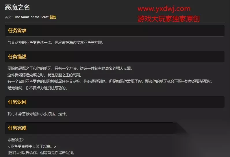 任务完成地点 玩家需要前往艾萨拉东北边的亚考兰神殿。 亚考兰神殿就在任务接取地点的正北方,玩家可以选择在陆地上骑马过去,也可以选择游过去。 玩家需要一路杀进亚考兰神殿,找到里面的海巨人之神亚考罗克。 然后向亚考罗克询问恶魔领主的真名,开启下一步任务。