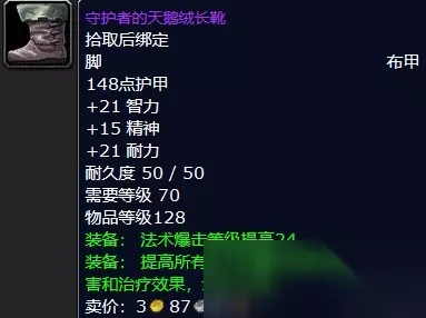 【魔兽怀旧服毒蛇神殿掉落列表】【魔兽怀旧服鱼斯拉掉落物品列表】 :布甲 :史诗 :拾取后绑定 :脚 148点护甲 +21智力 +15精神 +21耐力 耐久度:50/50 需要等级:70 物品等级:128 装备:法术爆击等级提高24。 装备:提高所有法术和魔法效果所造成的伤害和治疗效果,最多49点。 :毒蛇神殿副本BOSS鱼斯拉(7.7%掉落率)。