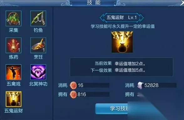 原料获取技能:采集、钓鱼 物品制作技能:炼药、烹饪 养生类技能:五禽戏、北冥神功、五鬼运财。 生活技能面板:点开技能按钮,页签中选择生活技能。 采集: 主要用于收集炼药、烹饪的半成品原材料。 钓鱼: 主要用于收集烹饪的半成品原材料。 炼药: 用于生产可装备的药品、药品半成品。 烹饪: 用于生产食品和食品半成品。 养生类技能: 五禽戏:学习技能可永久提升一定的气血上限。 北冥神功:学习技能可永久提示一定的法力上限。 五鬼运财:学习技能可永久提升一定的幸运值。